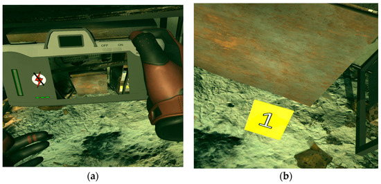 In the VR environment, participants also had access to interactive tools that supported documentation and orientation. A key element was the camera. In the police scenario, evidence was documented using a smartwatch camera, whereas in the firefighter scenario participants were equipped with a virtual camera. The firefighter scenario also included additional aids such as lamps and measuring tapes. Modern VR simulators for forensic training typically include such interactive elements. For example, RiVR Investigate [13] provides a virtual camera, markers, a flashlight, and a gas detector to enable realistic evidence collection.