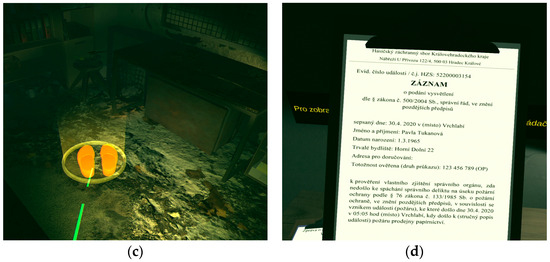 The firefighter scenario simulated the investigation of a fire in a real commercial stationery store. The blocks differed in the cause of the fire: Block 1—technical fault (short circuit in an electrical socket), Block 2—human negligence (a cigarette butt left in an ashtray), Block 3—proximity of flammable textile to a heating unit. The key interactive element was the documentation of evidence (e.g., burn marks, charred electrical appliances, or remnants of the heating unit) using a virtual camera. An illustration of the VR scene is shown in Figure 2, where screenshots from the application present the participants’ key tasks, i.e., working with the camera, collecting evidence, navigating the environment, and accessing the report from the responding firefighters.