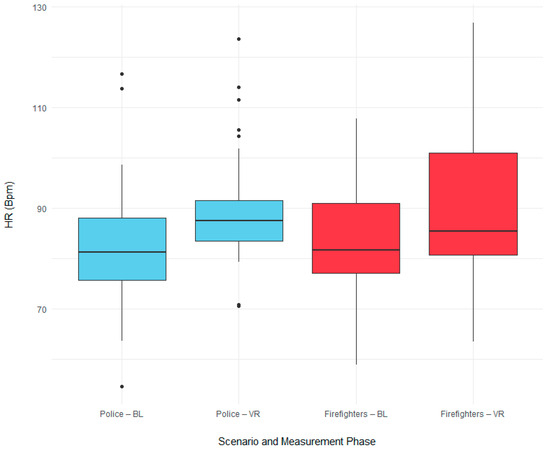 Results from the pilot measurements are summarized in Table 1, Table 2, Table 3, Table 4, Table 5, Table 6 and Table 7 and Figure 3, Figure 4 and Figure 5. Table 1 and Table 2 present descriptive statistics (median, Q1, Q3) of HR and HRV parameters (lnSDNN, lnRMSSD) across all three blocks (Block 1–3) and both two phases (baseline [BL], VR exposure [VR]) for the police and firefighter scenarios (e.g., “HR BL 1” is bringing together all heart rate BL measurements during block 1 of selected police or firefighting scenario).