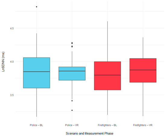 To illustrate the overall differences between the measured values of parameters HR, lnSDNN, lnRMSSD during BL and VR exposure phases, summary boxplots were created, including all measurements across individual blocks (Block 1–Block 3) and all participants (P1–P10), separately for police and firefighter scenario, see Figure 3, Figure 4 and Figure 5 Each box represents the aggregated value distribution (n = 30) for the given scenario and all three phases together. The aim was to capture the overall trend and range of physiological changes between phases and at the same time identify differences in the degree of autonomic activation between the individual scenarios, i.e., to determine in which type of training environment the group changes were more pronounced.