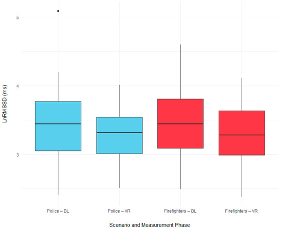 To illustrate overall differences between the two scenarios, summary boxplots were created, including all measurements across blocks and participants for each VR scenario separately (police and firefighter), see Figure 3, Figure 4 and Figure 5. The aim was to compare physiological changes and determine in which type of training environment group changes were more pronounced. In the VR phase of both scenarios, an increase in medians compared to BL is observable, with a more pronounced spread in the police scenario (see Figure 3 and Figure 4). In the firefighter scenario, a slight increase in the median during the VR phase is evident, while in the police scenario the median remained approximately the same. The wider interquartile range and the presence of numerous outliers in the VR phase of the police scenario suggest considerable interindividual variability (see Figure 3 and Figure 4). In the VR phase of both scenarios, a decrease in the median lnRMSSD is observable (see Figure 5). This parameter serves as a sensitive indicator of parasympathetic activity.