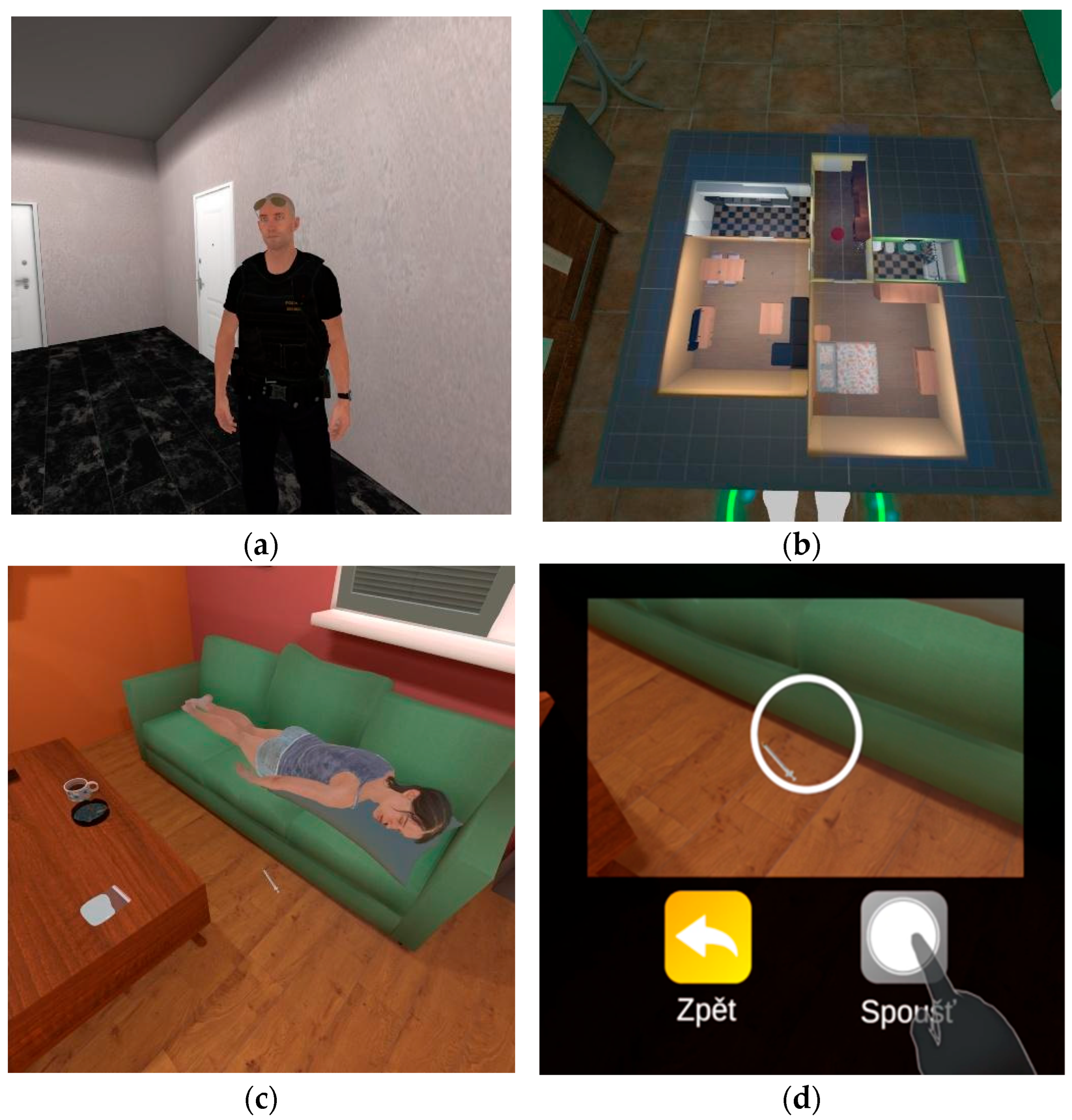 12], in cooperation with the Bavarian State Criminal Police Office (Bayerisches LKA), created the innovative training system Investigations in Virtual Reality. Training is conducted within a specialized three-day course, “3D Crime Scene & Accident Reconstruction with RealityCapture,” aimed at teaching forensic experts how to acquire evidence from crime scenes using photogrammetry, LiDAR technology, and aerial imaging. VR scenarios are based on authentic 3D models of real crime scenes, including fire and traffic accident sites, recorded in controlled conditions in cooperation with LKA. The scenarios allow for role division among investigators, experts, or observers, and also offer advanced tools for retrospective analysis, including motion tracking, eye-tracking, action timelines, or visualization of individual investigative steps. The system is built on the Unreal Engine platform with an open architecture that supports flexible deployment on various VR devices (e.g., HTC Vive, HP Reverb G2). A commercial example is the RiVR Investigate training system developed by Reality in Virtual Reality, which is described in detail on the manufacturer’s official website [