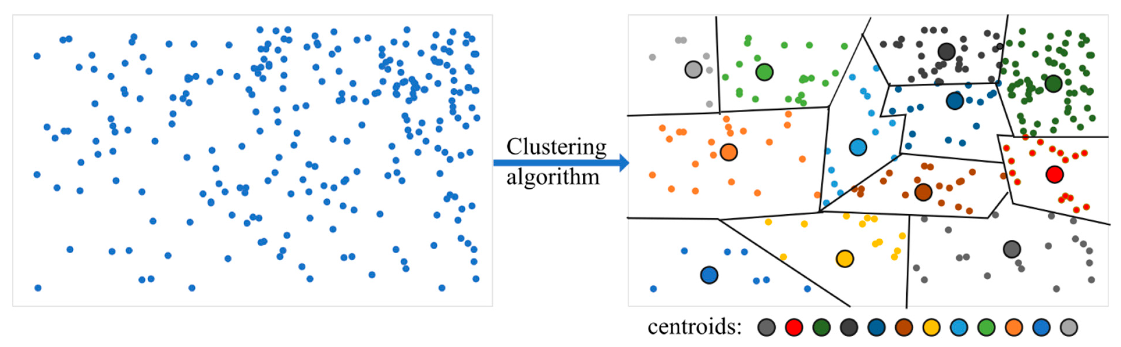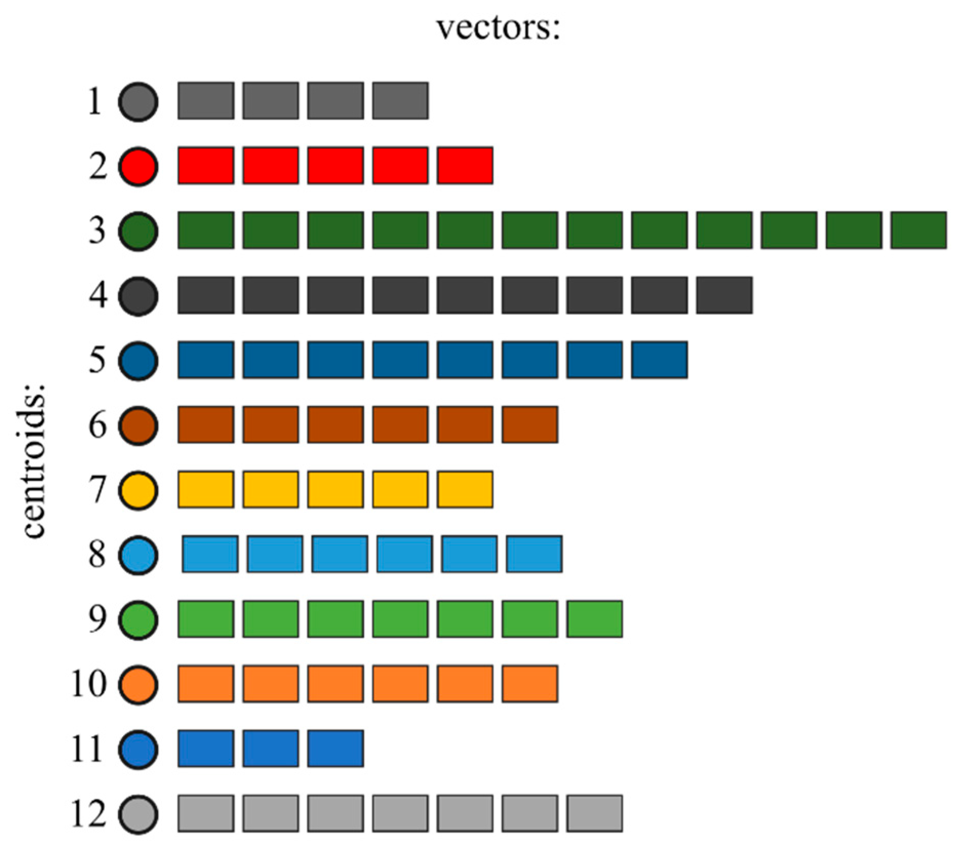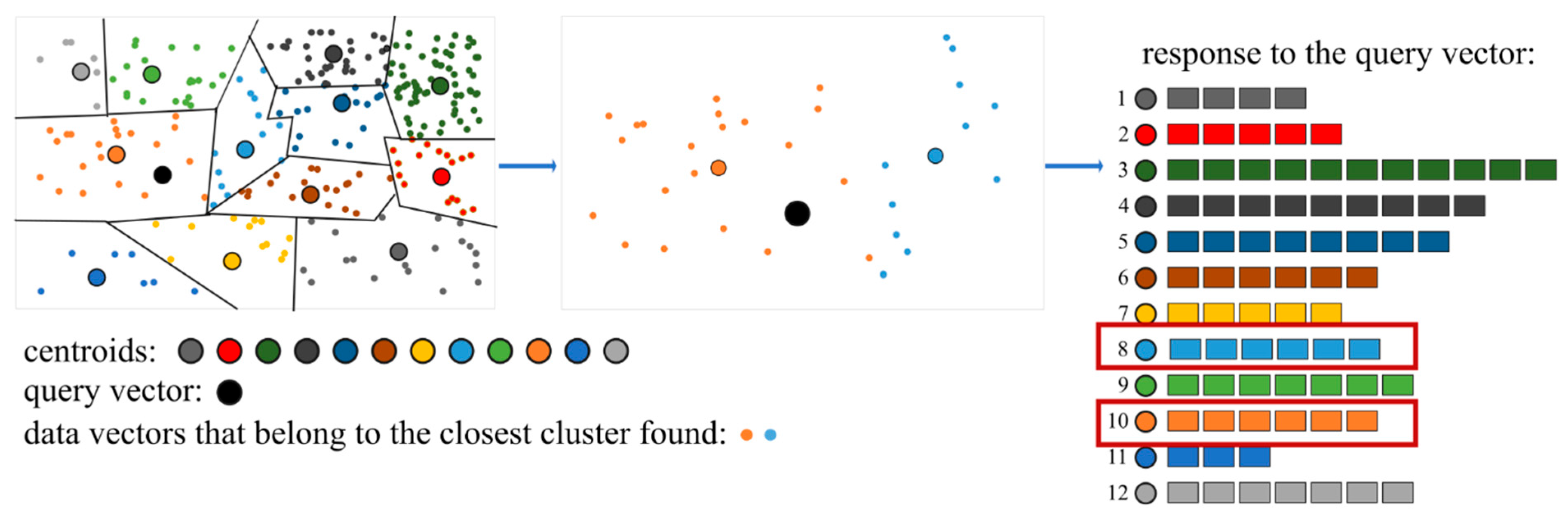 To obtain the centroids of the clusters, the IVF index-building algorithms (which are out of the scope of this paper) may use the standard k-means clustering algorithm (Indexes 3–5 in