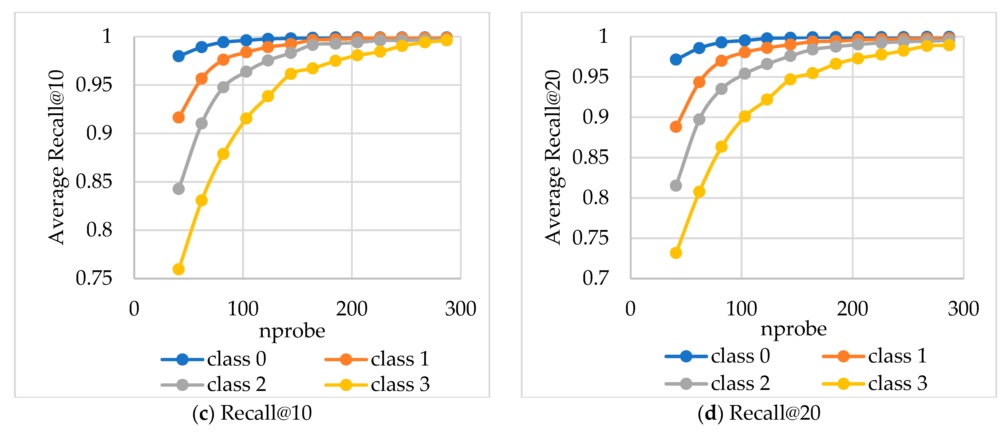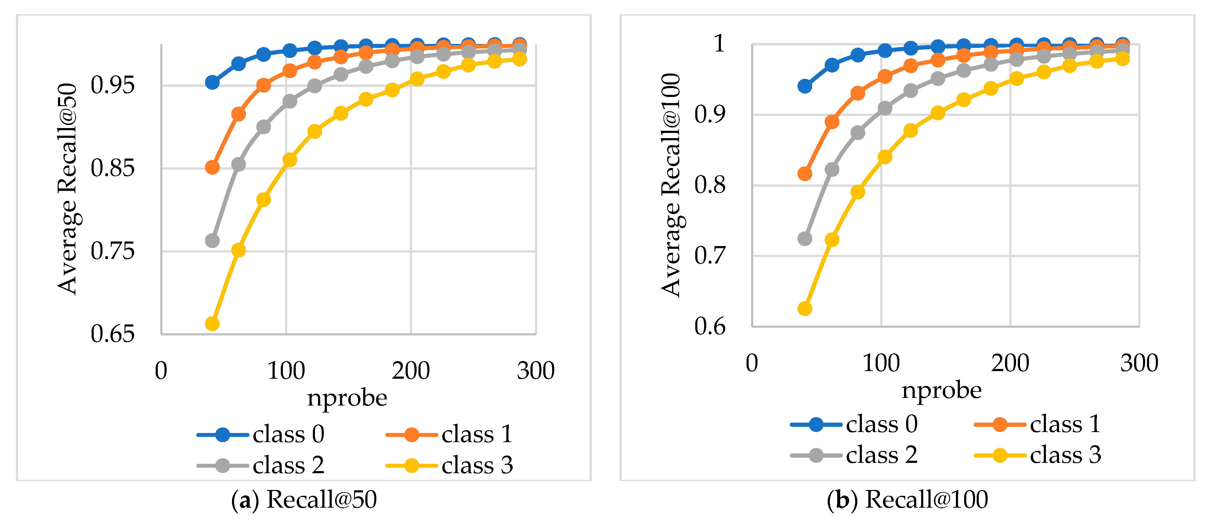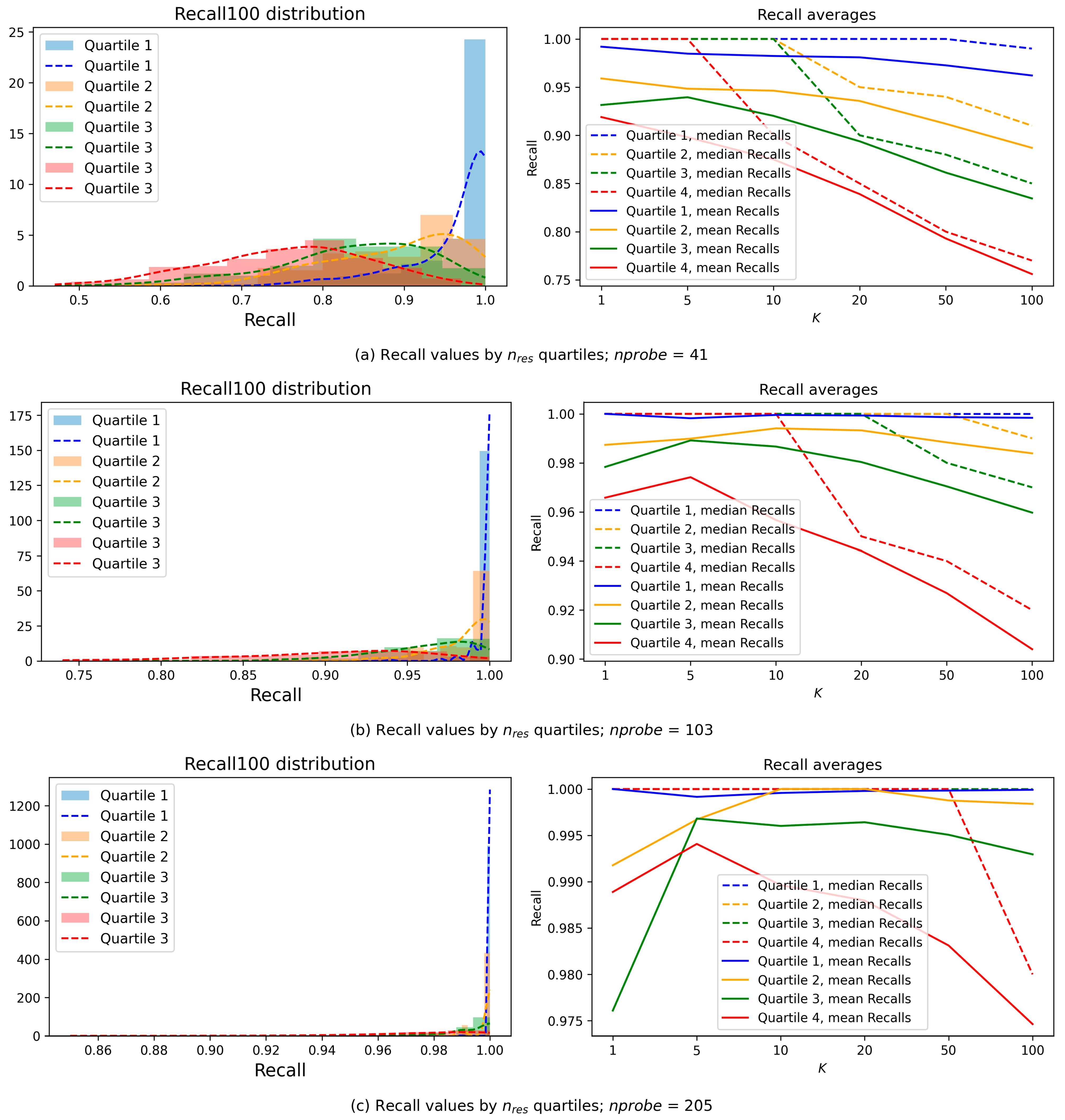 Then, we analyzed the changes in query processing results with the number of neighbors K set to 100, depending on various stages of processing and the number of processed clusters nprobe. We investigated the impact by varying the number of processed clusters on the quality and efficiency of the results, which is an important aspect of optimizing data processing algorithms. The findings contribute to a deeper understanding of the relationship between the number of clusters and processing outcomes, holding both theoretical and practical significance for further research.