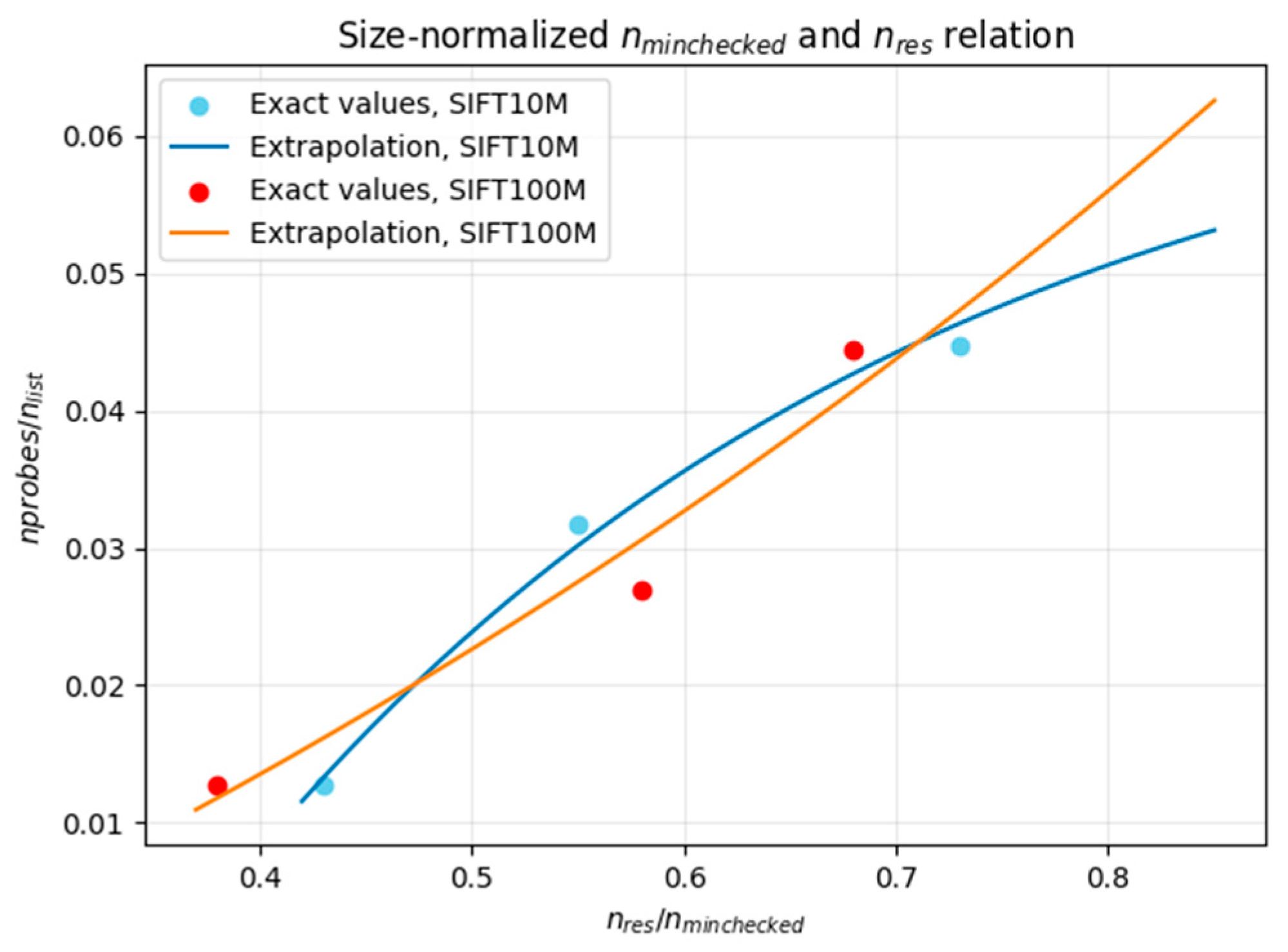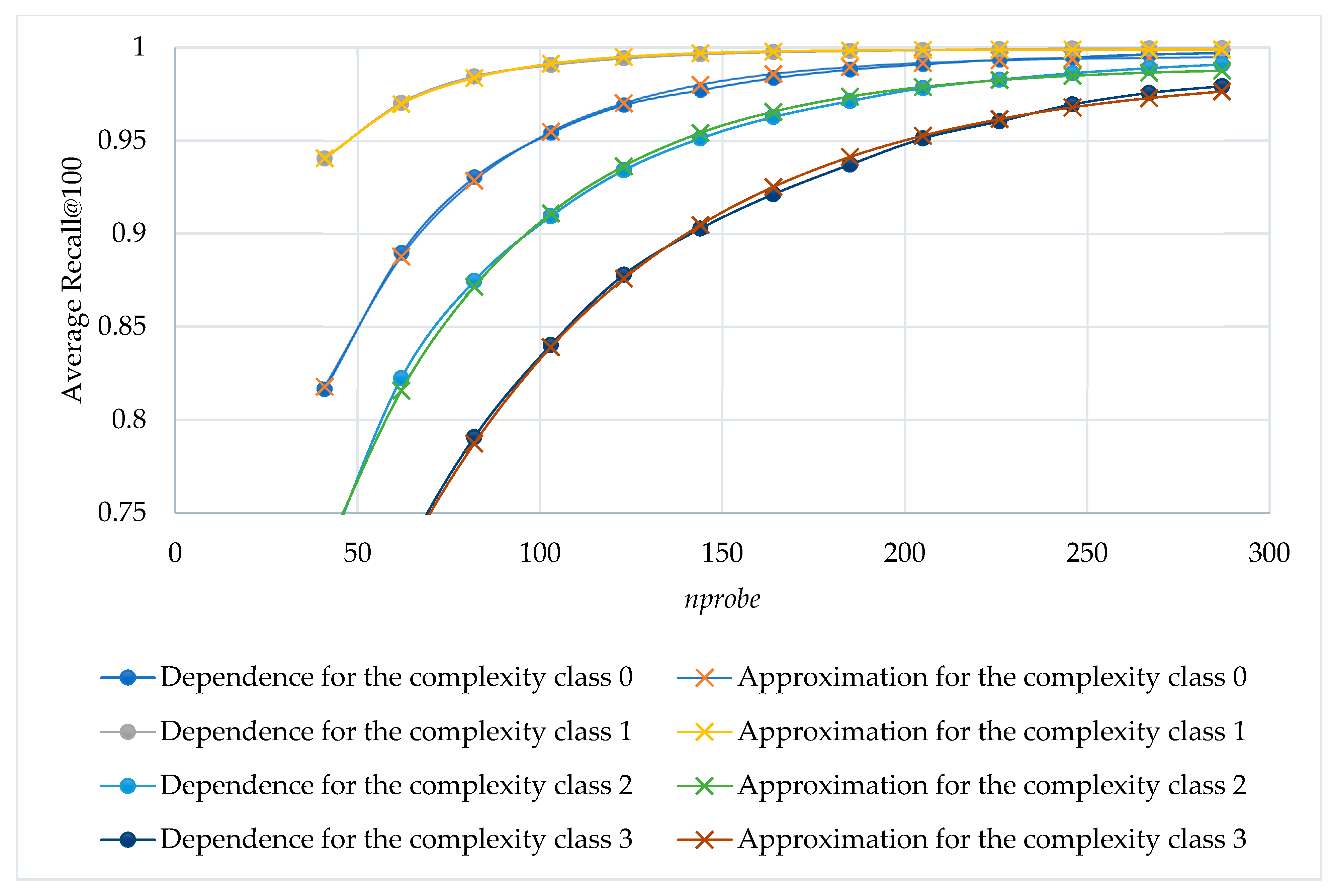 Algorithm 2, which should be run after building the IVF index, provides almost all the parameters for Algorithm 3, which performs the adaptive IVF query processing. However, the parameter nminchecked (minimal number of clusters to be scanned) must be set in advance. On the one hand, this parameter determines the relative size of complexity class Class1 (the simplest queries). Thus, the value for nminchecked should be chosen so that the ratio of this class is approximately equal to the other classes., i.e., scanning nminchecked clusters must be sufficient to achieve the desired Recall value for ¼ (25%) of queries (approximately). On the other hand, the choice of nminchecked value is essential for the correct work of our classifier which is based on the nres value. If the total number of clusters in the IVF index is small, then a small number of scanned clusters provide the desired Recall for 25% of queries. In this case, since nres values are integers, the discrete nature of these values may result in us getting the same M1–M3 values for different query classes. From our experiments, this happens if nminchecked does not exceed 20. The question of the minimum acceptable values for nminchecked remains open. However, since our research is our study aims to achieve high Recall values for fairly large datasets, we assume that the IVF index contains at least several thousand clusters, and thus the number of the scanned clusters is at least several dozen, which is sufficient for Algorithm 2 to set different values of parameters M1–M3 for the complexity classes.