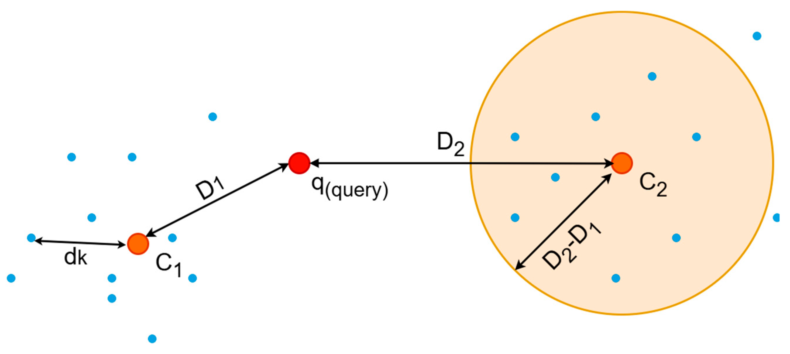 23], the authors investigate the impact of dimensionality on the nearest neighbor search efficiency. In high-dimensional spaces, the contrast between the closest and farthest points diminishes, illustrating the so-called “curse of dimensionality”. To overcome the curse of dimensionality, the approximate nearest neighbor search (ANN) approaches were proposed. The key advantage of the ANN is its ability to efficiently compute approximate solutions, leading to substantial improvements in speed and reduced memory usage compared to exact nearest neighbor search methods. In certain cases, the dataset size makes the full exact search computationally infeasible within a reasonable time. In other situations, the difference between the exact and the approximate nearest neighbor search results may be minimal or insignificant.