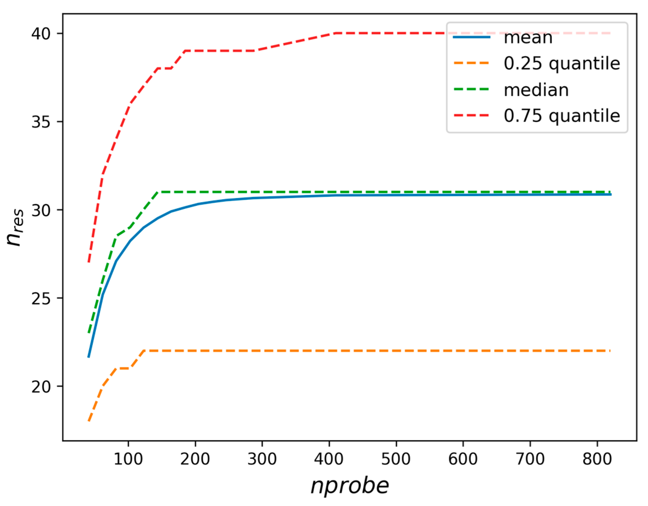 The values expected K, expected recall@ K, nminchecked, M1, M2, M3, S1-S4 (Algorithm 2) constitute a supplement to the IVF index. Expected K represents the number of neighbors for which the index is built. Expected recall@ K indicates the anticipated Recall level for those K neighbors. Initially, nminchecked refers to the number of clusters processed to calculate the nres values. M1, M2, and M3 serve as the boundaries between classes. Additionally, S1–S4 are the average values of nprobe at which expected recal@K is successfully achieved.