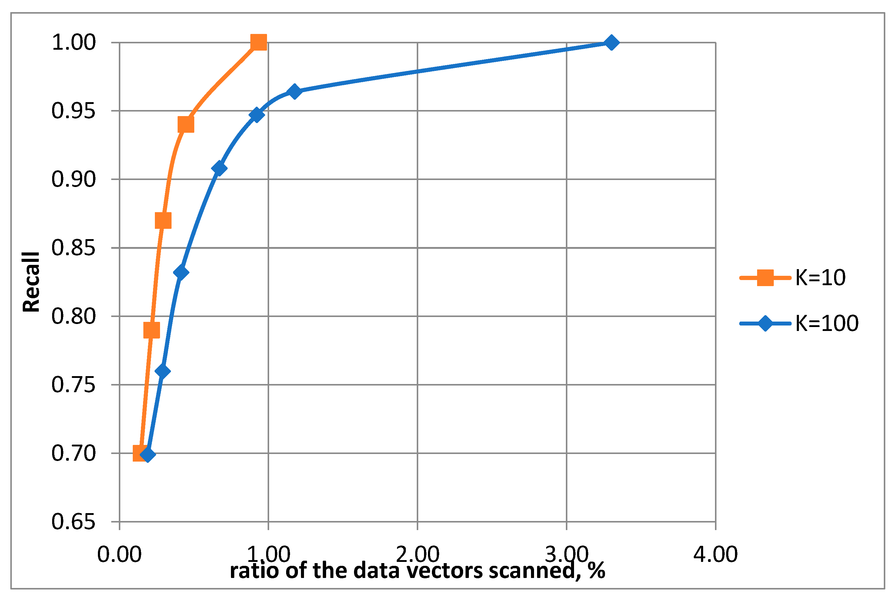 90], the authors report that their version of the HNSW search requires only 0.03% of data vectors to be processed (which is 338,739 times less than the brute force requires), while the QPS value increases only by a factor of 6.86 (in comparison with the brute force). Unlike more sophisticated index structures—such as HSNW—the IVF index has a very simple structure: lists of data vectors grouped into clusters. In the case of large datasets, the clusters are relatively big data arrays that occupy sequentially located areas on the disk drive which are processed in a very simple way: simply reading and calculating the distances. In fact, the speed of such processing depends almost only on the disk drive performance. Thus, despite our new search algorithm requiring much more data vectors to be scanned than graph-based methods, it enables us to achieve a significant increase in search speed (compared to the brute-force search; see