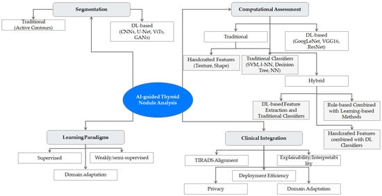- A comprehensive taxonomy of AI-guided methods, systematically organizing approaches from traditional image processing to state-of-the-art DL models like ViTs. Figure 1 presents a visual roadmap of the topics discussed, organizing the landscape of AI-guided thyroid US image analysis into its core components.