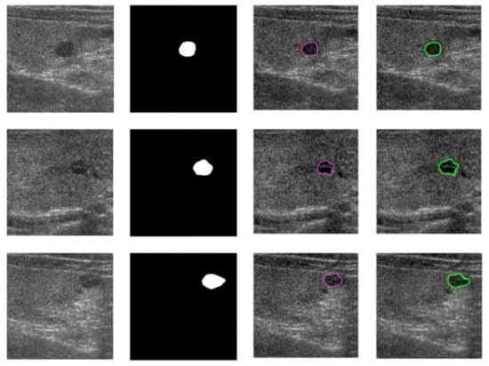 Examples of thyroid nodules in US images: (first column) original thyroid US images; (second column) ground truth annotations; (third column) segmentation results with manual parameter adjustment; (fourth column) segmentation results with automatic parameter adjustment. Reproduced from [], which is an open-access article distributed under a Creative Commons Attribution 4.0 International License.