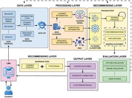 This layered approach facilitates scalability, modular development, and easier integration with current educational platforms. It also allows for clear separation of concerns: from data acquisition and transformation, to real-time student modeling, pedagogical alignment, and personalized recommendation delivery. Each layer is designed to operate independently and in coordination with the others, enabling the system to respond dynamically to student needs while respecting educational constraints and ethical principles.