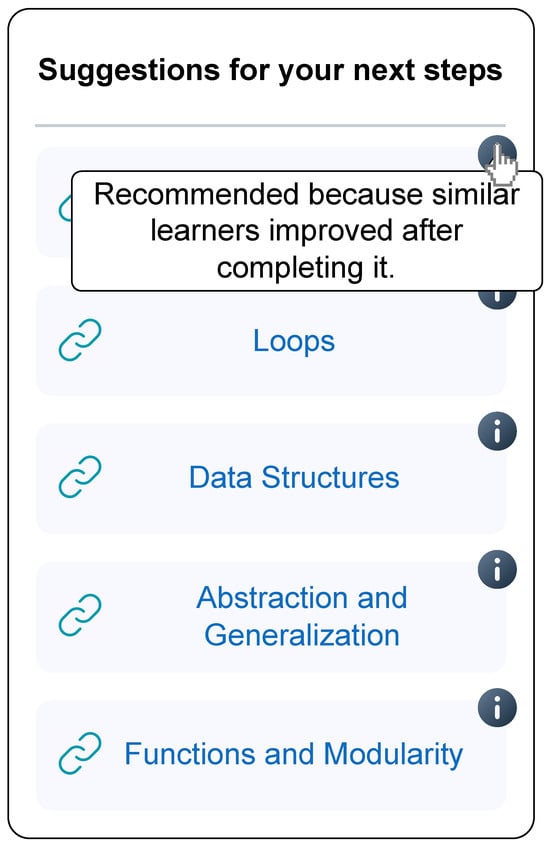 Closely related is the risk of diminishing learner autonomy. Recommendations, if not clearly framed as optional, may undermine students’ sense of control over their educational journey. Autonomy is central to motivation, self-regulated learning, and ownership of the learning process. To avoid this, recommender interfaces must emphasize transparency and provide students with the ability to ignore, question, or override system suggestions.