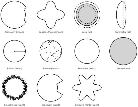 | texture_worst | Variation in texture (e.g., smoothness, granularity) of the nucleus. | Textural irregularity is higher in malignant cells. |