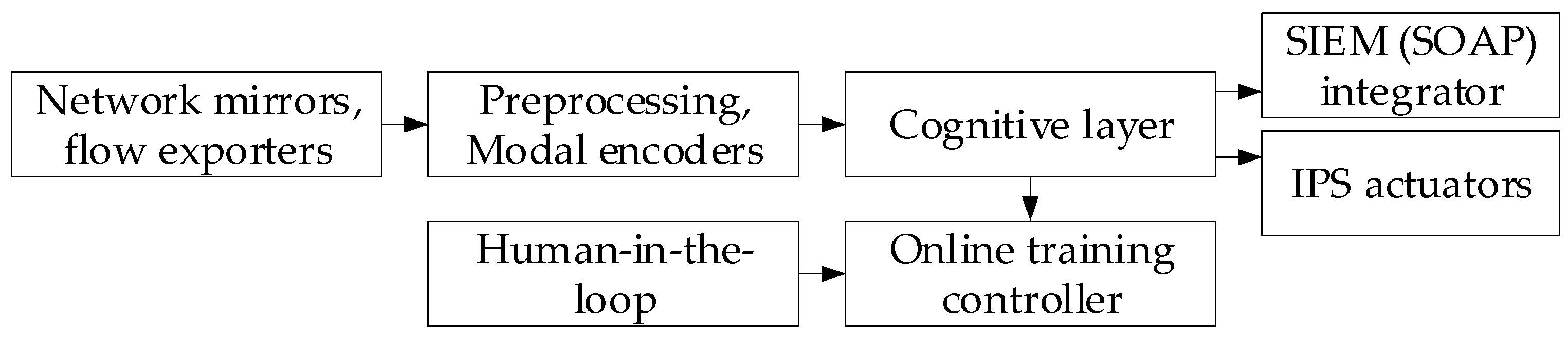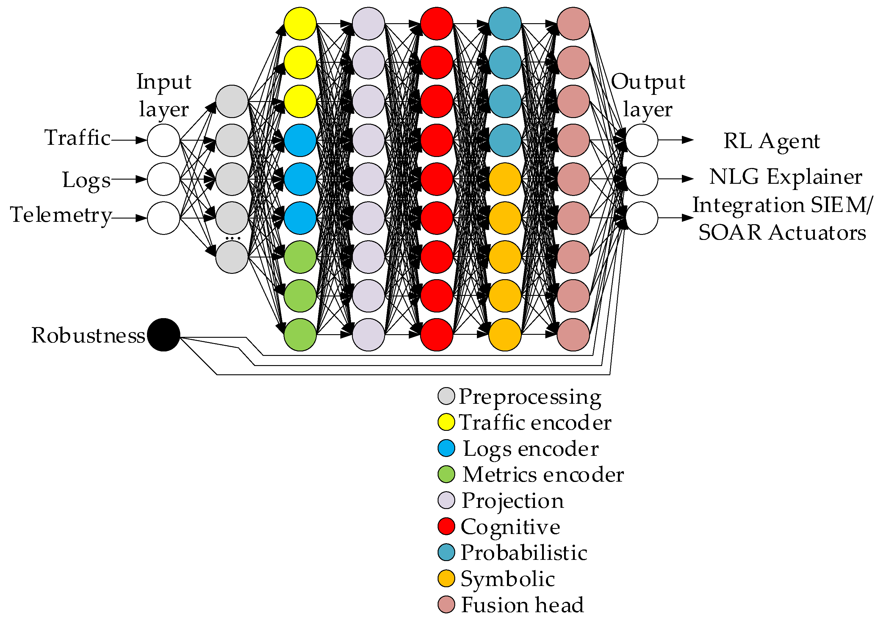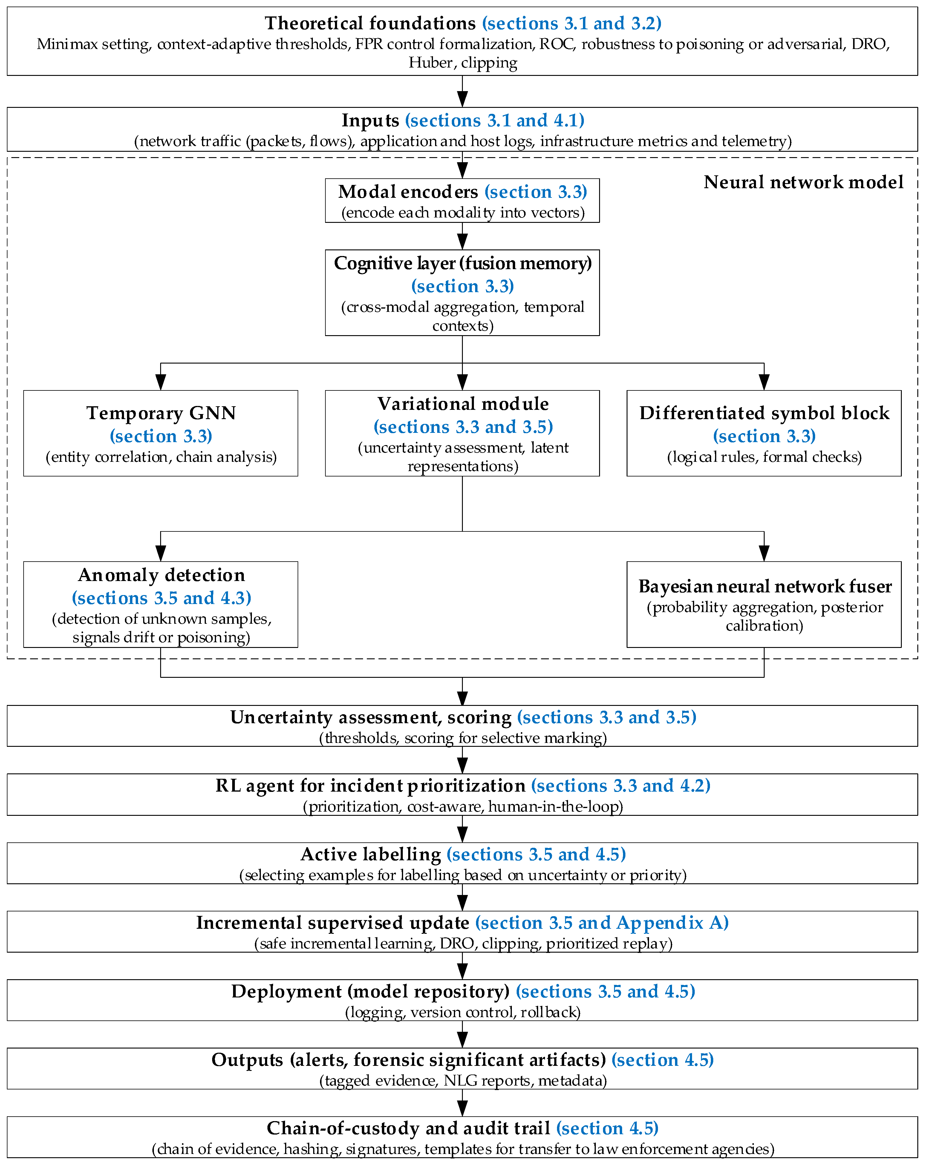 Based on the above, this study proposes a solution (Figure 3) based on a hybrid multimodal architecture. Network flows, logs, and telemetry are encoded by modal encoders and combined in a cross-modal fusion memory to construct a unified incident context. A temporal GNN ensures entity correlation and the complex relations identification, a variational module formalizes uncertainty, and a differentiable symbolic block embeds formal rules and improves explainability. A Bayesian neural network fuser aggregates probabilistic estimates and transmits novelty or anomaly detection signals to the uncertainty scoring subsystem. An RL agent and prioritization mechanisms guide the selective labelling process by experts (active labelling), whose results are used for secure incremental model updates while preserving audit trails. The custody protocols and NLG module chain produce verifiable artifacts and calibrated alerts, guaranteeing drift resistance and forensic suitability.