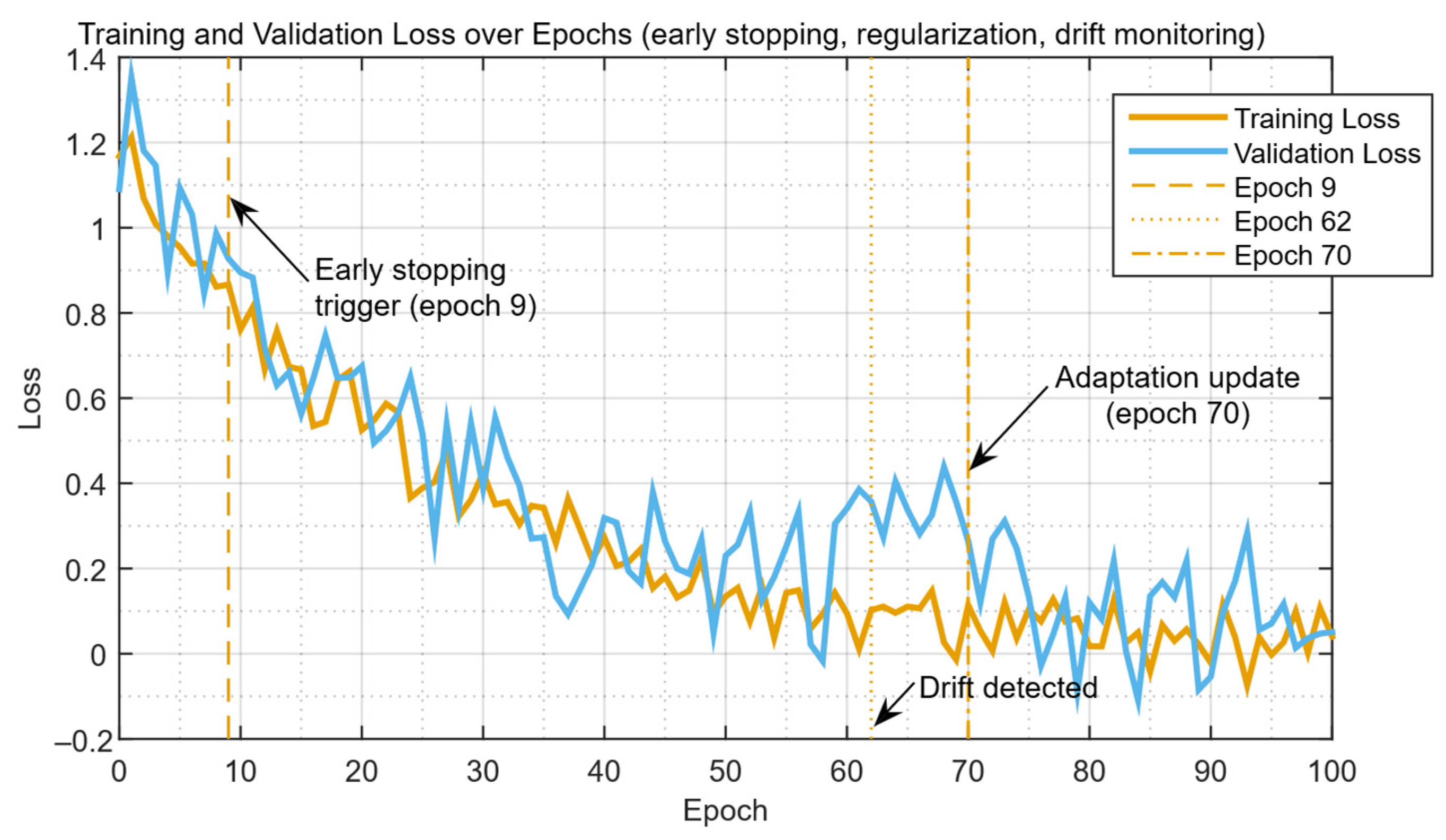 In response to the changing data distribution and the attacks’ new classes’ continuous emergence problem, research on online training [34], adaptive ensembles [35], drift detection methods [36], and active learning in streaming data [37] has become widespread in recent years. Research [38,39,40,41] proposes mechanisms for concept drift detection (ADWIN [38], DDM [39], etc.), incremental model updating [40], and selective data labelling strategies [41]. However, many of them demonstrate difficulties in obtaining timely and reliable labelling in combat conditions and are computationally intensive.