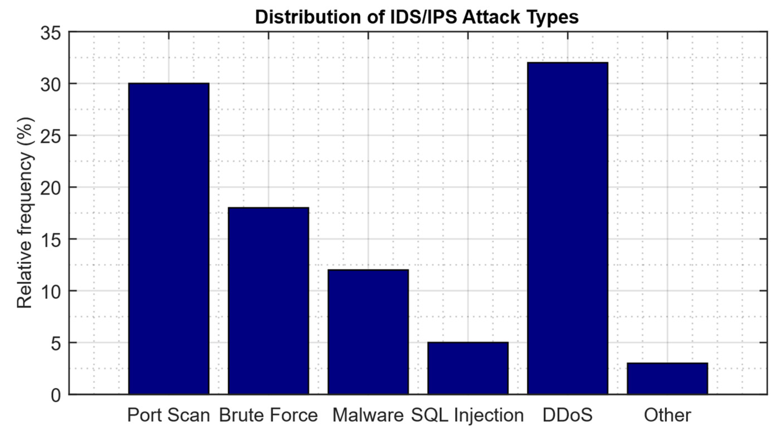 It is known that IDS/IPS intrusions are attempts to violate the confidentiality, integrity, or availability of information resources that are detected or blocked by intrusion detection and prevention system (IDS/IPS) means [1]. An IDS (intrusion detection system) records suspicious activity and generates notifications or logs for analysis, and an IPS (Intrusion Prevention System) not only detects but also automatically takes action to block traffic or sessions considered malicious [2]. In this research, “IDS/IPS intrusions” are understood as both targeted attacks (port scanning, password guessing, SQL injections, malware distribution, DDoS, etc.) and more subtle attempts to bypass protective mechanisms aimed at evading detection.