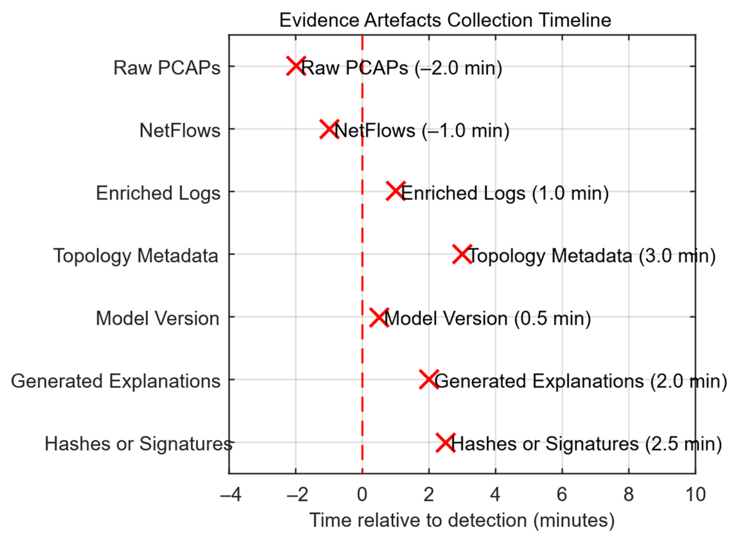 3Formalization of the forensic pipeline and legal validationEnsure the admissibility of the collected artefacts in investigationsChain-of-custody, hashing (signatures), using secure logging, coordinating templates with lawyersValid evidence packets proportion, packet preparation time, and integrity (hash)