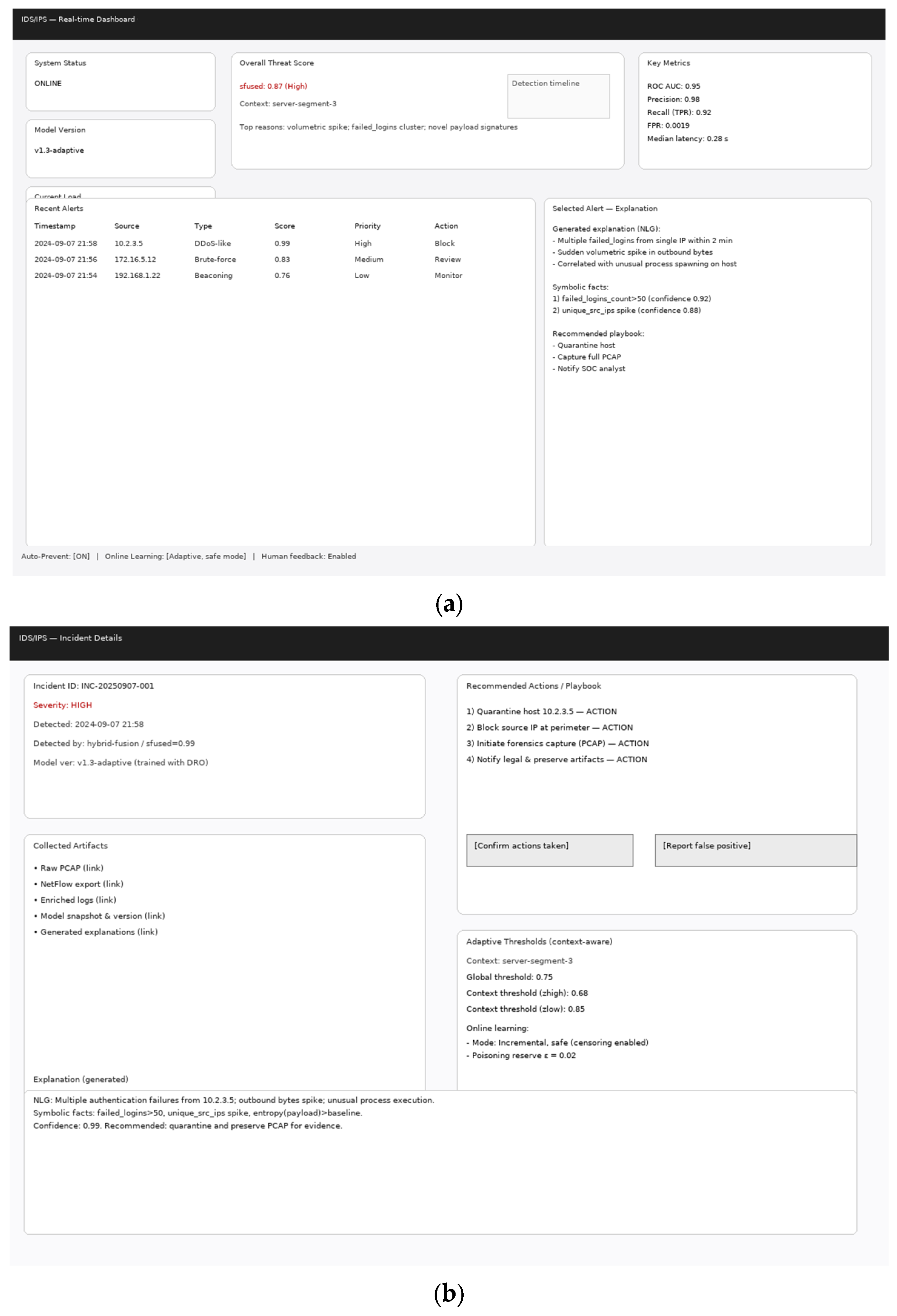 This article consists of traditional sections: “1. Introduction”, “2. Related Works”, “3. Materials and Methods”, “4. Case Study”, “5. Discussion”, and “6. Conclusions”. In Section 3, we formalize the theoretical foundations for intrusion detection and prevention (using LRT, GLR, SPRT, CUSUM, and information measures such as the Kullback–Leibler divergence and the Chernoff coefficient), substantiate the context-adaptive threshold advantages, and prove the minimax properties in a number of settings. In parallel, we introduce a model of robustness to targeted adjustments and poisoning (Huber-ε, clipped, and inf-LR criteria) with FPR/TPR shift estimates and “headroom” conditions to preserve sensitivity. We propose a complex hybrid architecture consisting of modal encoders for traffic and logs, a temporal GNN for entity correlation, a KV memory, a variational module for uncertainty, a differentiable symbolic unit, an RL agent for prioritization, and an NLG module for explanations, all united by a common multi-task learning. A computational cost analysis is performed (approximately 2.17 · 109 FLOPs of forward-run), with practical recommendations for optimization (local and linear approximation of attention, mixed-precision, caching, and sampling in GNN) and pointing out key limitations, which include sensitivity to the correctness of context modelling, the need for high-quality labelled multi-modal data, high computational cost, and the need for verification and hyperparameter selection during deployment. Section 4 describes the preparation and preprocessing of a multimodal experimental dataset (synchronized traffic time series, logs, and telemetry with simulated DDoS), a multi-stage protocol for hybrid model training and online adaptation, a virtual instance implementation with an incident interface and NLG explanations, detailed quantitative results (AUC ≈ 0.95, F1 ≈ 0.95), and a drift resilience with metric recovery study through accurate incremental adaptation. Practical recommendations for optimizations, computational cost estimation, and legal and forensic readiness requirements are also offered. Limitations, including the need for high-quality labelled data, significant deployment resources, and the need for standardized benchmarks for reproducibility, are highlighted. In the Discussion section, the authors summarize their contributions (formal justifications for context-adaptive thresholds and minimax-robust rules, hybrid multimodal architecture, and online training), while also noting limiting factors such as the need for high-quality labelled and contextual data, computational infrastructure, rigorous benchmark validation, and legal training for using the artifacts in law enforcement practice.