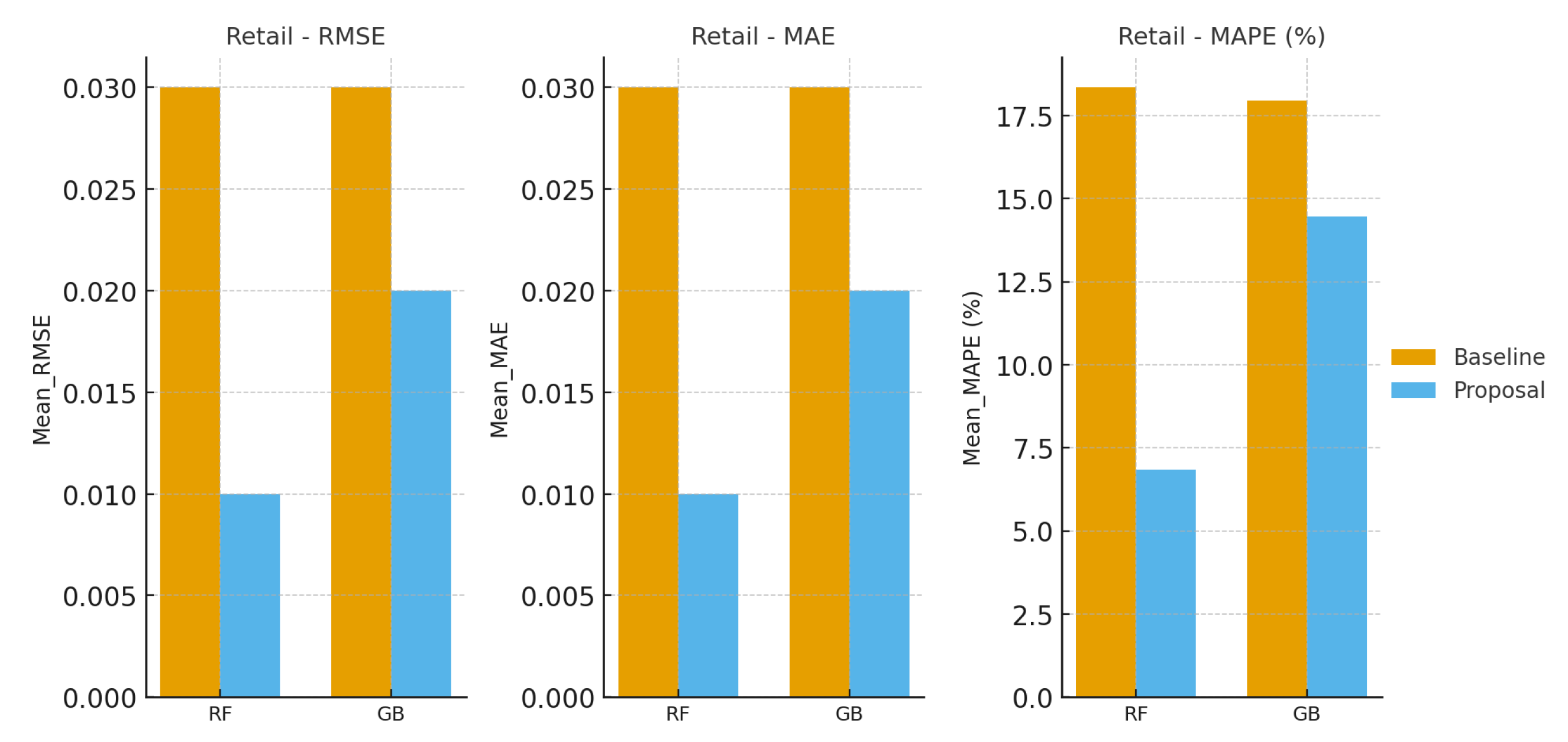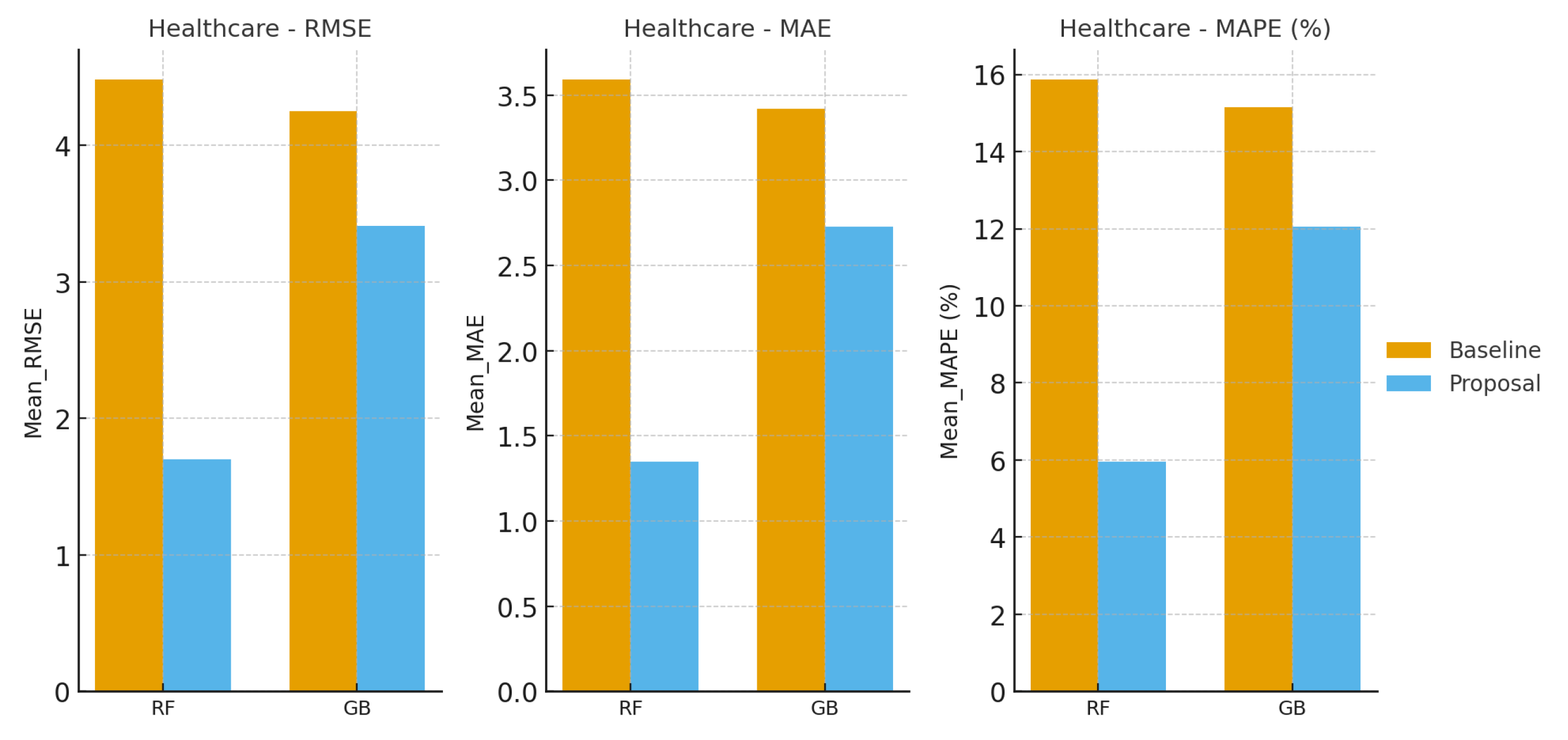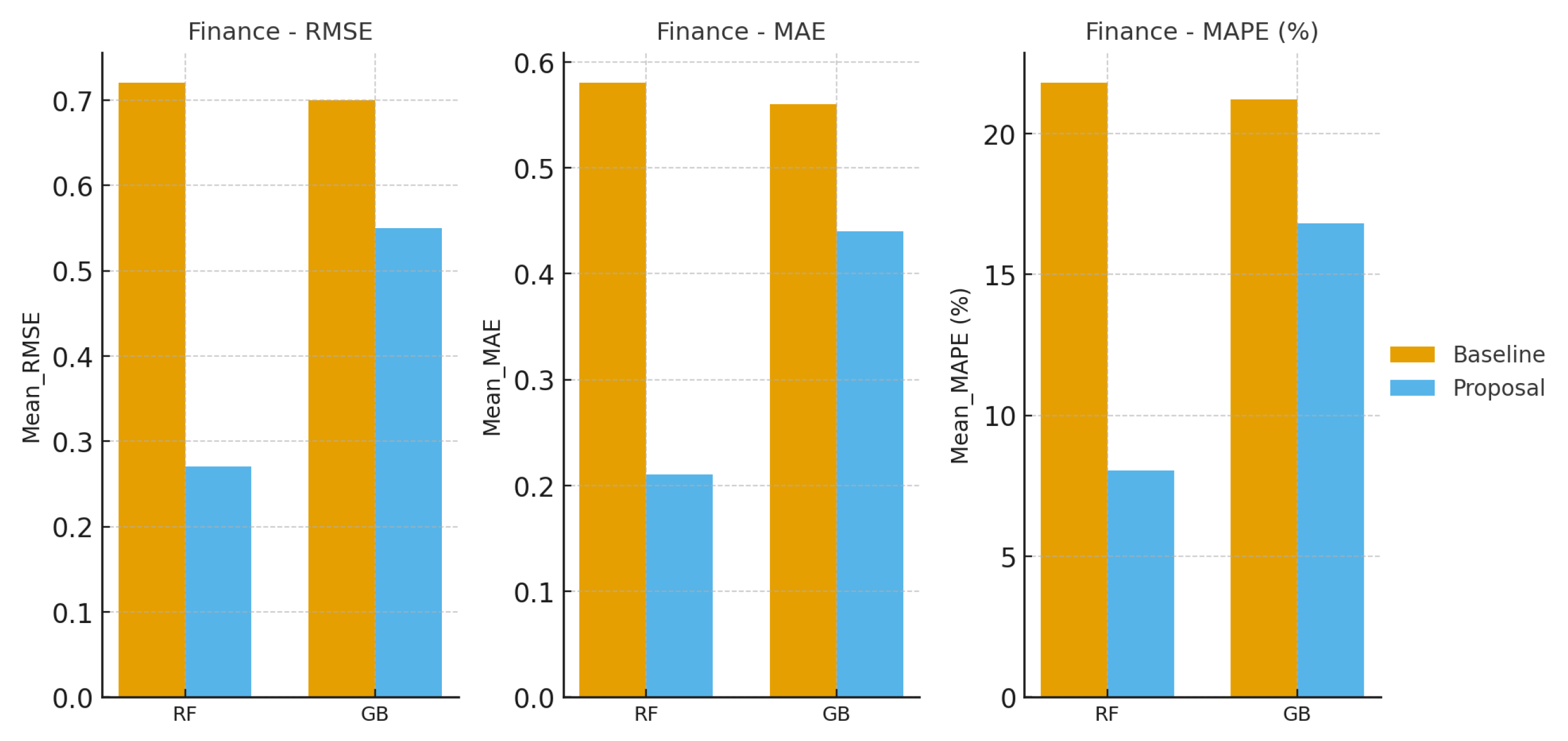 Table 3). Representative cases include Finance–RF, where Mean_RMSE drops from 0.72 (Baseline) to 0.27 (Proposal), a ∼62.5% reduction; Healthcare–RF, where Mean_RMSE falls from 4.48 to 1.70 (∼62.1%); and consistent MAPE reductions near ∼62–63% in Finance and Healthcare. Retail exhibits the largest point improvement in RMSE for RF (0.03 to 0.01; ∼66.7%), despite small absolute magnitudes. While improvements with Gradient Boosting are more modest (e.g., Finance–GB RMSE: 0.70 to 0.55; ∼21.4%), they remain directionally consistent. Taken together, these results show that upstream, statistically informed data selection confers tangible accuracy gains under fixed processing budgets.