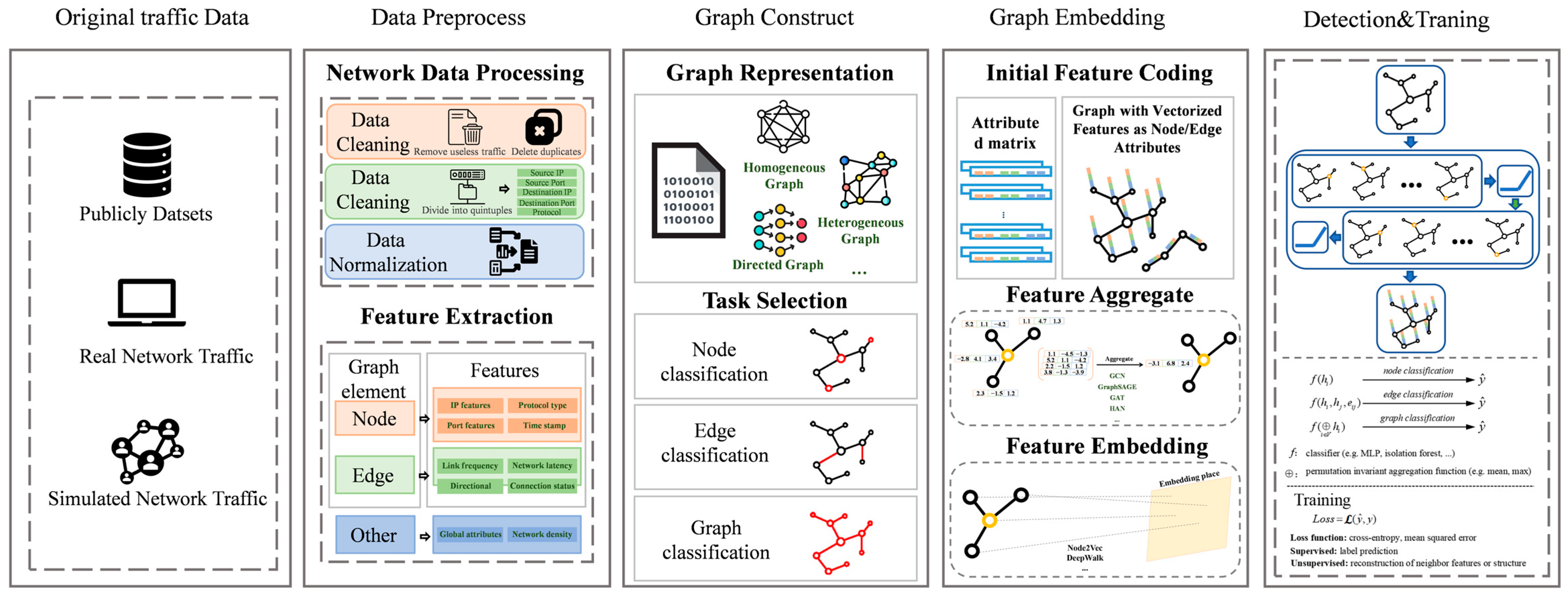 | [56] | MalDiscovery | 2023 | Encrypted malicious traffic detection | Homogeneous graph | GraphSAGE | Supervised |