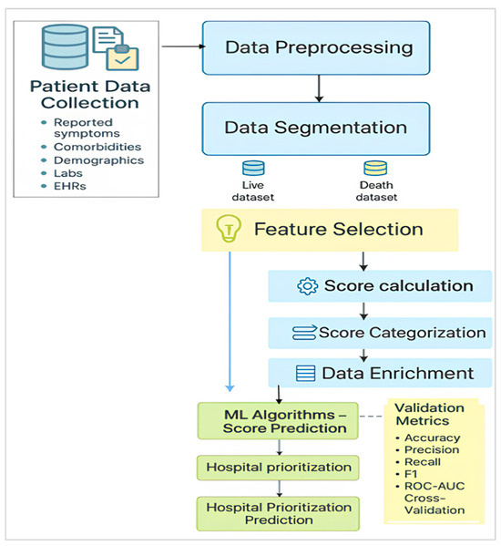 Following the widespread transmission of the pandemic, two of the most critical challenges will involve accurately assessing infection severity levels and determining hospitalization priorities. We offer an algorithmic approach which is mainly focused on features of patient data (D) for severity classification of infections and giving precise, easily scaled-up hospitalization recommendations. Our approach comprises a number of consecutively undertaken procedures that start with data preprocessing, feature selection, and computing the illness score level, and the integration of these models into existing healthcare applies predictive methods to obtain patient outcomes. Our methodology mainly aims at determining a dynamic and adaptive model that can precisely score the severity of infection from different patient datasets, enabling clinical decision-making processes to be directed accordingly. Figure 2 illustrates the overall workflow of our methodology.