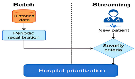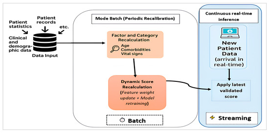 Complementing this general process, our approach introduces a hybrid mechanism combining batch processing and streaming. In batch mode, the weights and thresholds of the severity score are periodically recalculated from all available data, ensuring that the criteria are regularly updated. Depending on the operational context, this retraining can follow a fixed schedule (for example, daily or weekly) or be triggered by events such as a sudden influx of patients or the detection of data drift. Streaming mode, on the other hand, immediately applies these criteria to any new patient entering the system, ensuring near-instant prioritization and reducing clinical reaction time. This combination improves both the accuracy of decisions and their relevance to the rapid evolution of a health crisis.