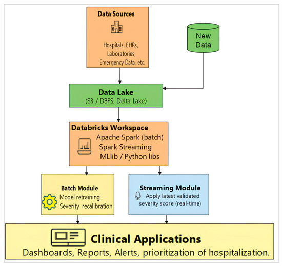 Indeed, this research proposal presents a series of factors with acceptable reliability and validity indices suitable for the prioritization of hospitalizations and has proposed a dynamic scoring model that can be adjusted to the type of health emergency situation. In this paper, we have provided a brief review of machine learning, brief details of the models used in the study, such as logistic regression, random forest, and artificial neural networks, and the improvement that our proposed approach brings to the prioritization of hospitalization. Among these, the highest accuracy was observed in the artificial neural network, equal to 98% in this particular case, and also high accuracy in both precision and recall, thereby showing the high accuracy of the model in critical decision-making situations. The application of our methodology is invaluable in high-patient-volume environments stressing healthcare systems by increasing the efficiency of decision-making activities, the reliability of data, and the rational expenditure of resources. Thus, by using a complex set of varying clinical and other demographic parameters, our versatile model is better suited for the changing nature of pandemics and remains a valuable tool for assisting clinicians in bio-medical decision-making regarding the management of patients. The work does not only focus on predictive accuracy. It also explores how routine batch recalibration can run together with live inference inside a scalable cloud setup. This structure was built in a way that it could later be reused for different kinds of healthcare data analyses. While the study was primarily designed for healthcare prioritization, it also brings methodological value to broader machine learning and data engineering practice. The proposed hybrid batch–streaming architecture demonstrates, in operational terms, how retraining mechanisms can coexist with real-time inference to support evolving data streams. By drawing on two complementary datasets—the Death and Live cohorts—the framework achieves a type of transfer calibration that limits imbalance and mitigates concept drift. The severity scoring mechanism, based on adaptive feature weighting, further contributes to model stability as input distributions shift. The implementation on Spark/Databricks, evaluated on over one million records in both modes, confirms the robustness and scalability of the overall design. These elements go beyond the specific medical case and reflect general principles that are transferable to other domains of data-intensive decision support. In the future, we aim to strengthen this framework in two main directions: first, by validating the model in prospective and multi-center studies to confirm its reliability in real hospital environments; second, by extending its use beyond COVID-19 to other health crises where rapid triage and resource prioritization are essential. These steps will help ensure that the approach remains both scientifically rigorous and practically useful for healthcare systems facing diverse challenges.