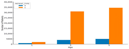 Our analysis reveals a marked trend in the age distribution of patients when crossed with the “PATIENT_TYPE” variable, as shown in Figure 8. Notably, age categories “3” and “5”—corresponding to the 50–70 and 70–90 age brackets—predominate among hospitalized patients (type 1). This strong predominance of older age groups suggests a higher propensity for hospitalization, which may reflect increased vulnerability or a higher risk of serious consequences in these demographic groups.