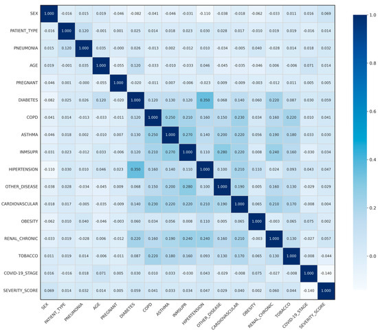 Variables like ‘PNEUMONIA’, which showed a strong correlation, were considered especially important. Although ‘PATIENT_TYPE’ is naturally linked to itself and used as a reference point in our analysis, we also kept variables with weaker correlations when they were clinically meaningful and did not overlap with others. For example, the variable AGE showed a very low linear correlation with hospitalization outcomes in our dataset. This does not reduce its clinical importance, since the relationship between age and severity is well known to be non-linear, with risk remaining low at younger ages and rising sharply at older ages. While this pattern is not reflected in the linear correlation coefficient, it is effectively captured during the modeling phase by the machine learning methods used in our framework, which are able to account for non-linear relationships. Including AGE as a feature was therefore essential from both a clinical and methodological perspective. Figure 4, which shows the correlation matrix, gives a clearer picture of how the variables relate to each other and supports the logic behind our feature choices.