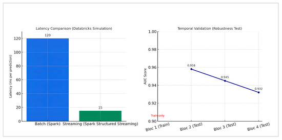 Beyond the evaluation on live test data, we designed two additional experiments to examine both the robustness and the real-time applicability of the proposed model. The first was a temporal validation, in which the dataset was split into successive chronological blocks to mimic deployment conditions. Since the ANN had already shown the best performance in earlier experiments (ROC AUC 0.958, accuracy 0.9869), this model was selected as the reference for the robustness test. The goal was not to re-run all candidate models but to illustrate how the framework can adaptively retrain the best-performing classifier over successive data inflows. The Live dataset (971,633 patients) was divided into four balanced subsets of about 243,000 patients each. Block 1 was used exclusively for initial training (no evaluation metric was reported on this block). ANN v1 was then tested on Block 2 (AUC = 0.958), ANN v2 was retrained on Blocks 1–2 and was tested on Block 3 (AUC = 0.945), and ANN v3 was retrained on Blocks 1–3 and was tested on Block 4 (AUC = 0.932). This sequential partitioning was designed to simulate successive patient inflows and provides a proof-of-concept for adaptive retraining under evolving conditions. The second experiment focused on operational feasibility. Using Databricks, we compared the latency of predictions in a classical batch setting (Spark) with that obtained in a streaming environment (Spark Structured Streaming). The results confirmed that the ANN preserved a high level of performance across the retraining cycles, with the AUC decreasing only slightly from 0.958 to 0.932, thus confirming robustness despite temporal drift. Concurrently, the latency benchmark via Databricks underlines its operational advantage over batch by lowering the average delay from approximately 120 ms with Spark batch processing down to just 15 ms with Spark Structured Streaming. Collectively, these results highlight the robustness of the predictions forwarded by our model and their utility for timely incorporation into clinical decision support systems (Figure 13).