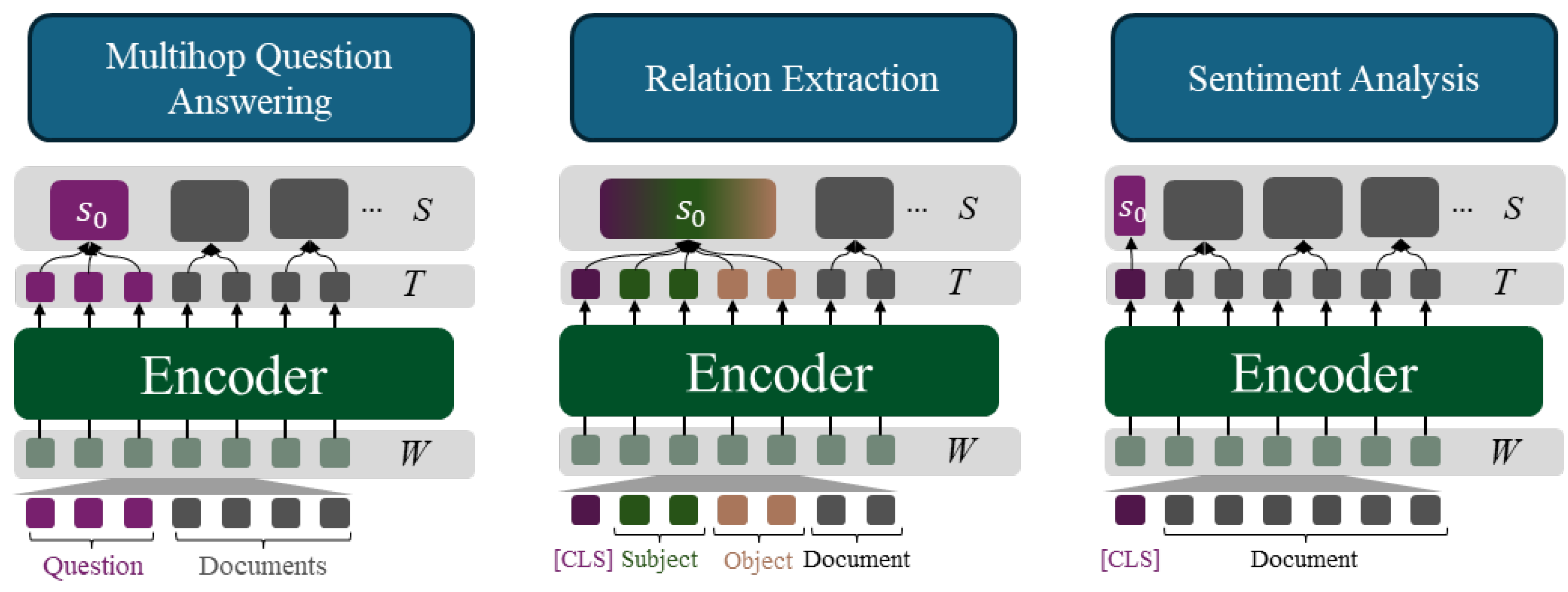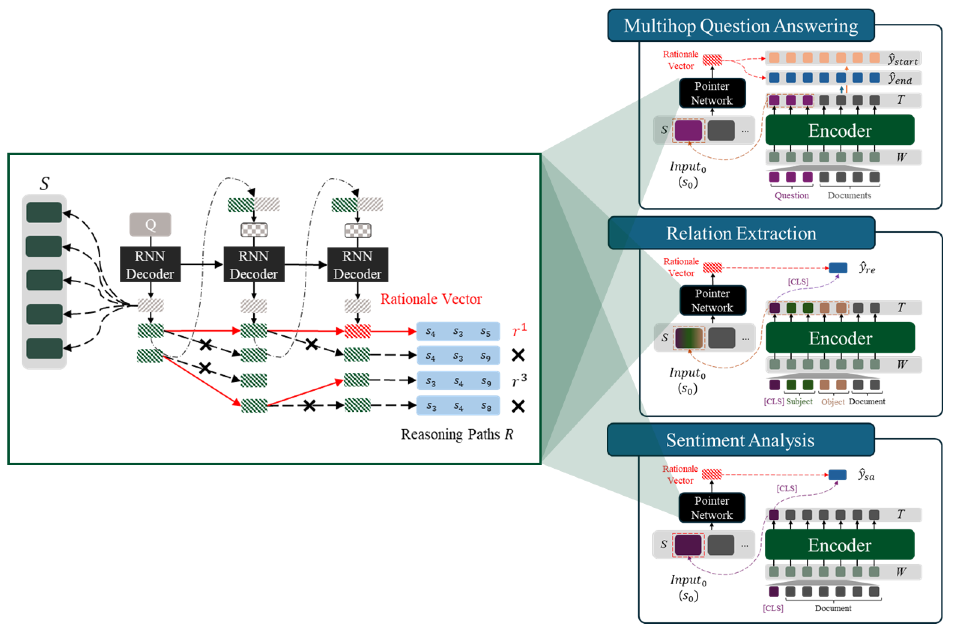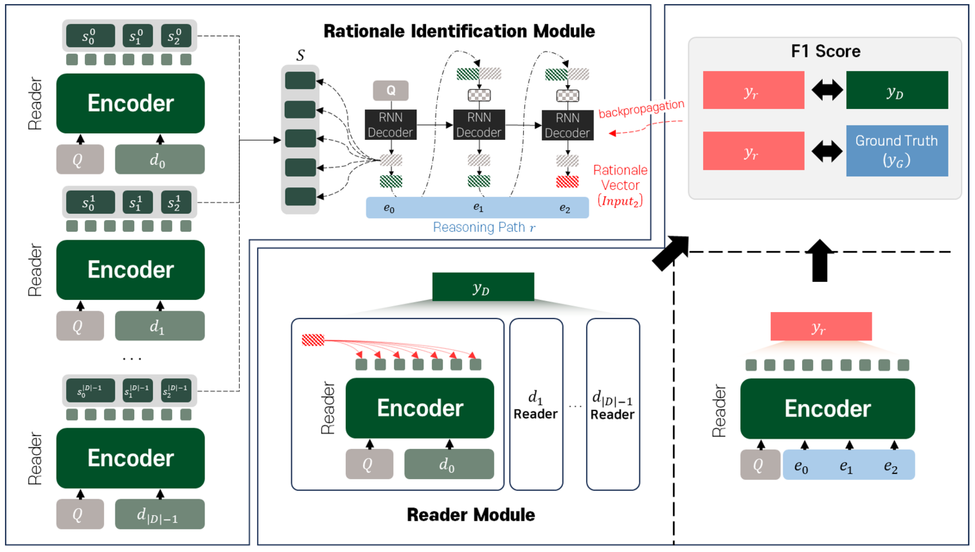 - The input sequence T follows the format: ‘ Question Document ’. The encoded token representations T are then processed to extract key evidence for reasoning.