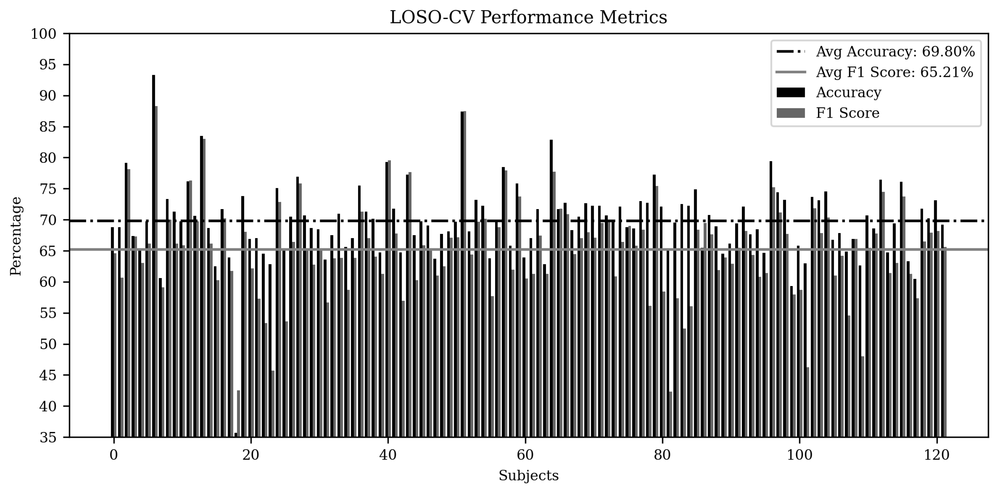 FACED dataset. Performance evaluation was conducted on FACED dataset under two training scenarios. In the first case, where all participants’ data were mixed and split into training, validation, and test sets, accuracy and F1 scores were averaged across multiple runs to ensure stability in results. the model achieved an accuracy of 66.22% and an F1 score of 64.98%, demonstrating competitive performance in emotion valence classification using a compact 4-channel configuration. In the second case, leave-one-subject-out cross-validation (LOSO-CV) was performed, where the model was trained on 122 participants and tested on one, with results aggregated across all iterations to evaluate subject-independent performance. The metrics are shown in