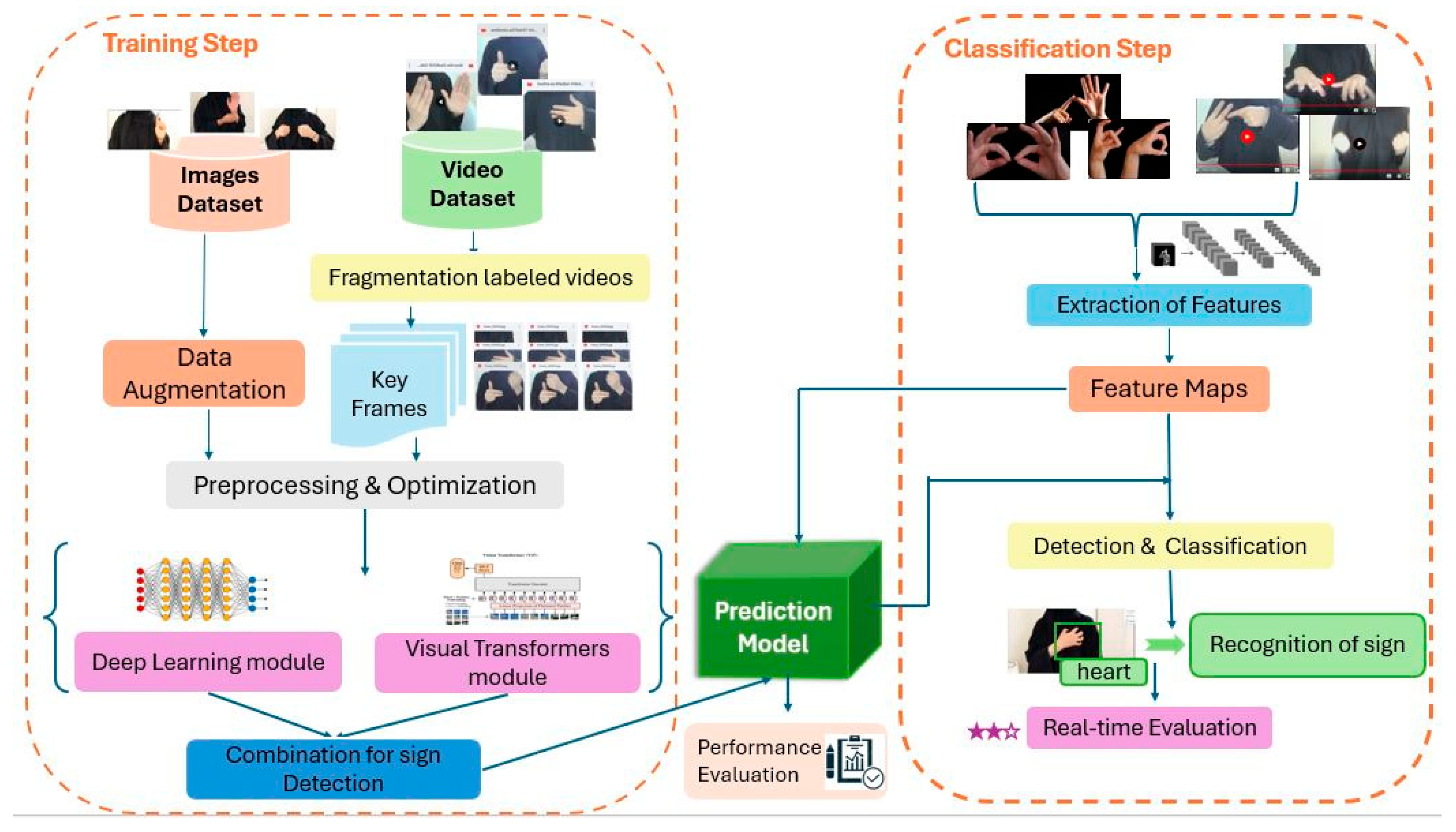 - Classification: A video input or image is processed through the trained model to extract feature maps, which are used for the detection and classification of signs. The classified signs are subsequently translated into textual output, facilitating the translation of ArSL gestures into corresponding words. The system will incorporate continuous evaluation to monitor performance, ensuring robust and accurate recognition. Thus, this approach utilizes cutting-edge deep learning techniques combined with transformer architecture to provide a scalable solution for ArSL recognition.