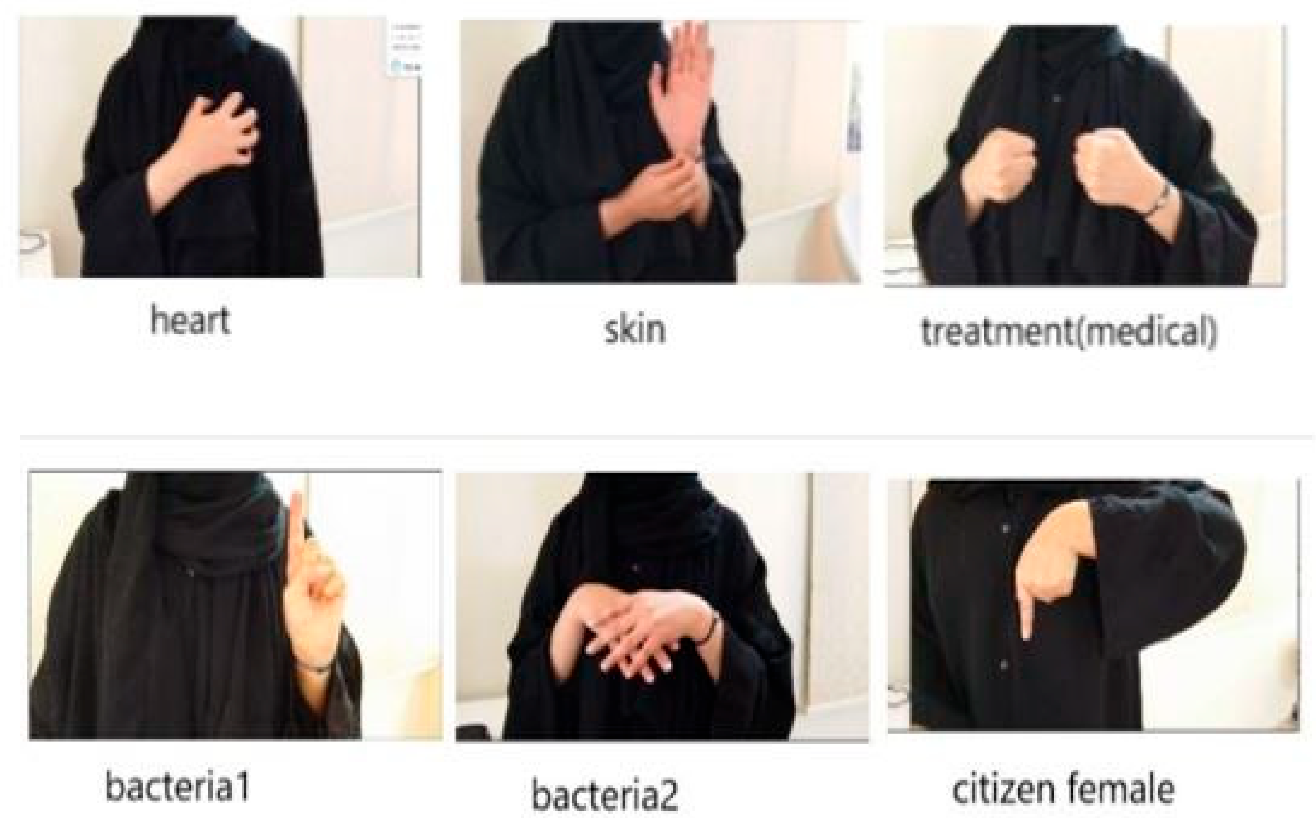 - Al-Nafjan, A.; Al-Abdullatef, L.; Al-Ghamdi, M.; Al-Khalaf, N.; Al-Zahrani, W. Designing SignSpeak, an Arabic Sign Language Recognition System. In Proceedings of the HCI International 2020—Late Breaking Papers: Universal Access and Inclusive Design, Copenhagen, Denmark, 19–24 July 2020; Stephanidis, C., Antona, M., Gao, Q., Zhou, J., Eds.; Lecture Notes in Computer Science. Springer International Publishing: Cham, Switzerland, 2020; Volume 12426, pp. 161–170, ISBN 978-3-030-60148-5. [Google Scholar]
