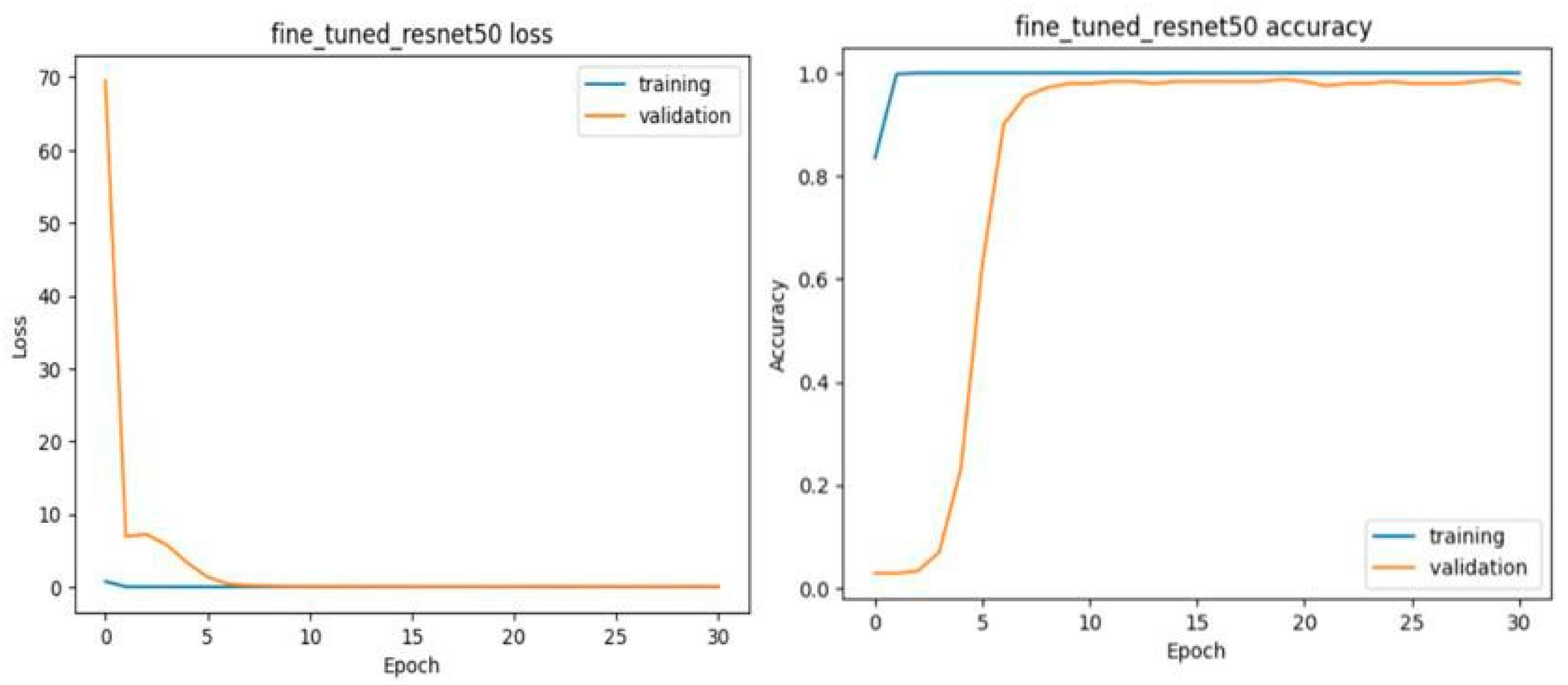 | ResNet50 Fine-tuned | 30 | 99% | 86% | 0.03 | 98.03% | 0.02 | 0.005 |