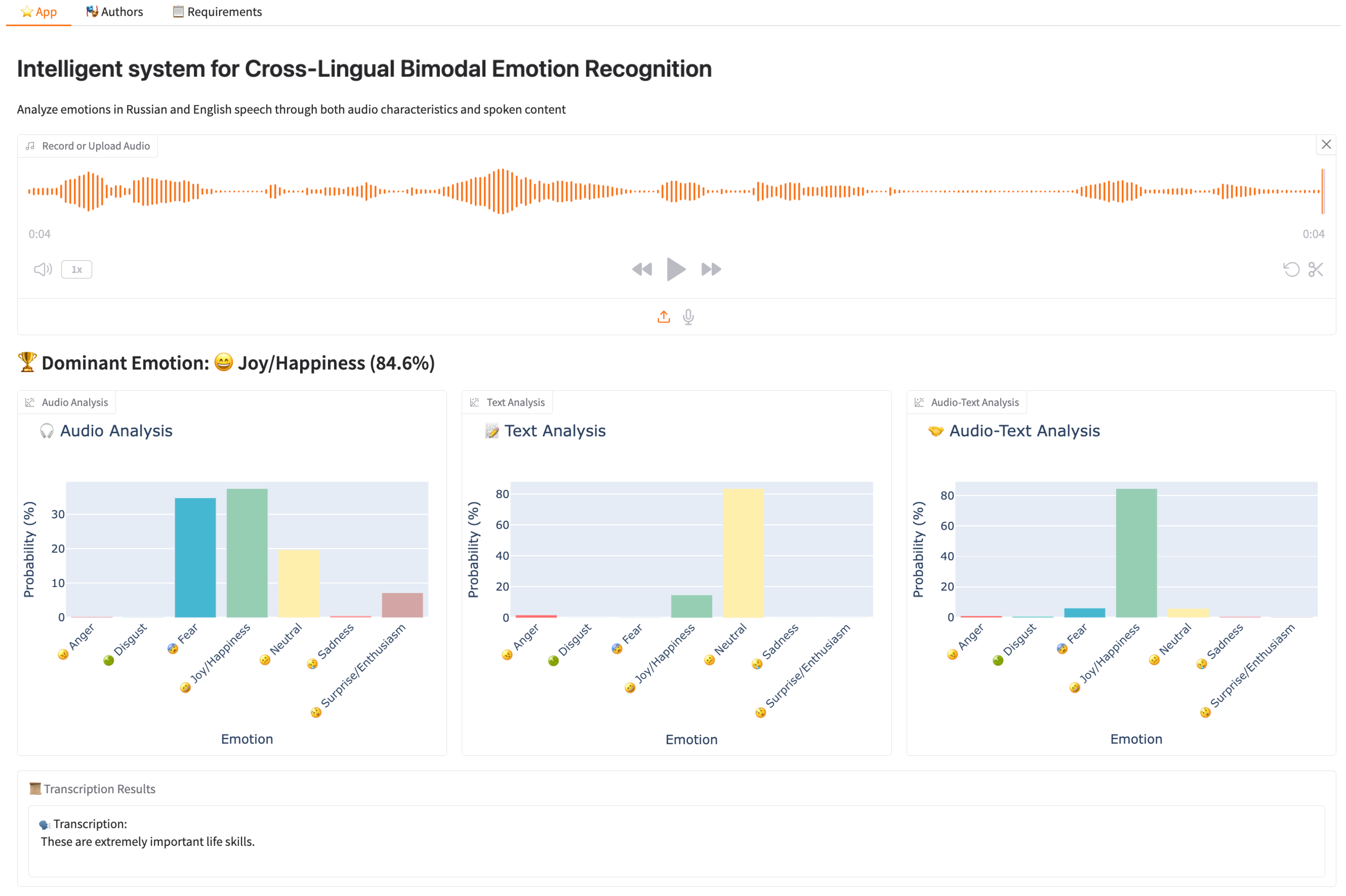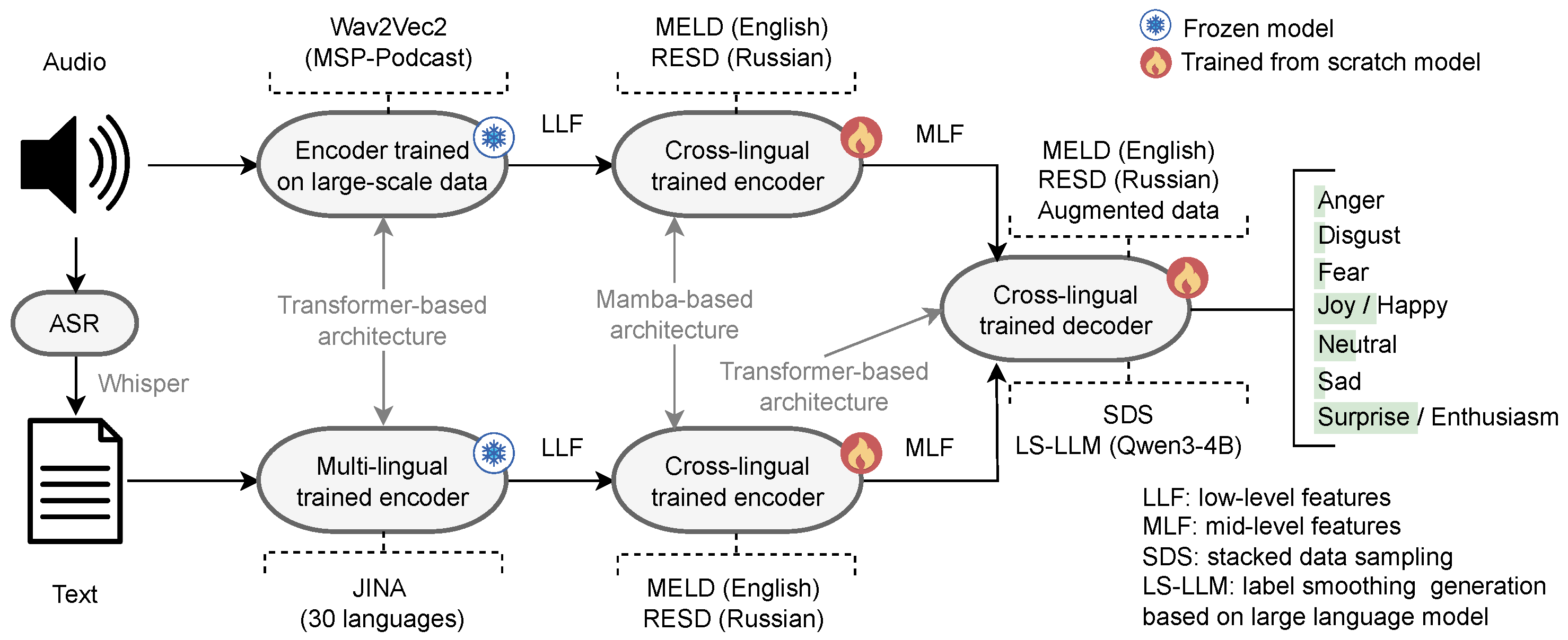 To address these limitations, a BER method is proposed that integrates audio and text modalities using cross-lingual encoders fine-tuned jointly on Russian Emotional Speech Dialogs (RESD) (Russian) [