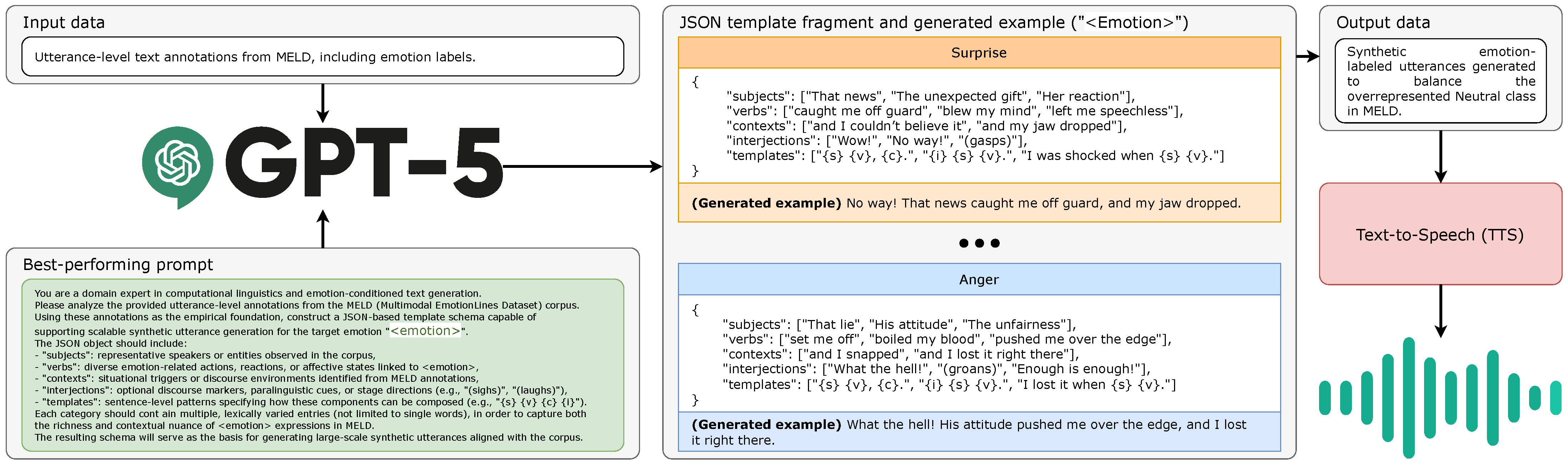 https://github.com/declare-lab/MELD, accessed on 28 September 2025) corpora. To combine the outputs of unimodal encoders, a fusion model is introduced, which is based on a Transformer architecture with cross-modal attention, enabling feature interaction across time and feature axes. To mitigate overfitting and improve generalization, three complementary data augmentation strategies are developed and systematically evaluated.