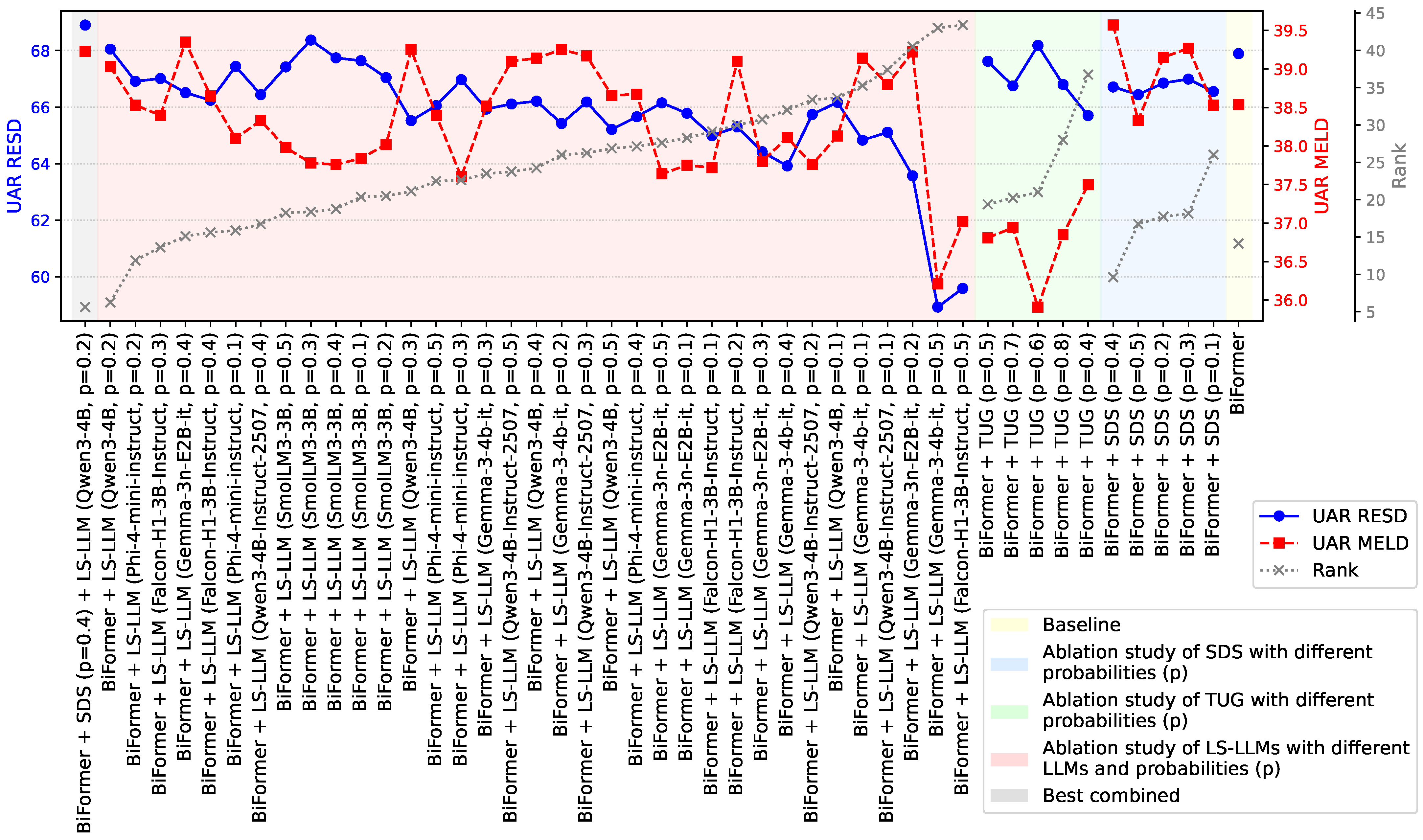 | Wav2Vec2.0- and Jina-v3-Mamba | BiFormer + SDS (p = 0.4) + LS-LLM (Qwen3-4B, p = 0.2) | 39.23 | 39.30 | 57.39 | 57.18 | 68.90 | 69.10 | 69.29 | 69.38 | 2.63 |
