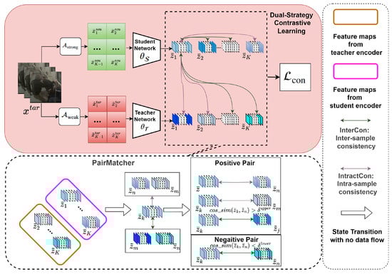 To align samples from different distributions, we propose a new contrastive learning mechanism with two key components: Intra-Sample Consistency: Treat a sample and its differently augmented versions as a positive pair, while considering all other samples as negative pairs. Inter-Sample Consistency: To identify positive pairs of the same class from different samples within a batch, we regard samples with similarity scores exceeding as positive pairs. To better distinguish samples from different classes, samples with similarity scores below within the same batch are treated as negative pairs. In this Figure, is the feature map obtained after sample undergoes the strong augmenter and is fed into the encoder in the student network; is the feature map obtained after sample undergoes weak augmentation and is fed into the teacher encoder in the teacher network. Here, K represents the number of augmentations. Contrastive learning enables the unsupervised approach of pulling closer the distance between samples of the same category in the input space while repelling samples from different categories [,]. While this mechanism is commonly applied in few-shot learning, our work draws inspiration from the core principle of contrastive learning: pulling similar samples closer and pushing dissimilar ones apart in the feature space. As illustrated in Figure 2, we propose a dual positive-negative pair matching strategy to compute the NT-Xent loss (Normalized Temperature-scaled Cross Entropy) [,] for both positive and negative sample pairs. We call the module dual-strategy contrastive learning (DCL). The input contains augmented samples by the weak augmenter and strong augmenter. These samples first undergo positive-negative pair matching via the Pair Matcher in DCL, followed by the computation of the NT-Xent loss using these pairs to achieve cross-domain sample consistency alignment. The Pair Matcher employs two distinct positive-negative pair matching methods to perform consistency alignment: