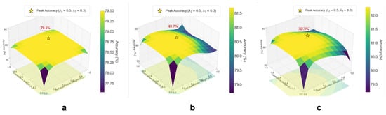 Influence of different parameter combinations with loss function for the model. We fix at and explore the most suitable combination of and by varying their values within the range with a step size of . Using the pre-trained SCTF model fine-tuned with CoMT-VD on RLVS (a), RWF-2000 (b), and their mixed dataset (c), and test different weight combinations on Hockey Fight. For clearer visualization, the figure shows the Gaussian-smoothed accuracy variations of fine-tuned models across different weight configurations. The trend reveals that the model achieves peak performance when and .