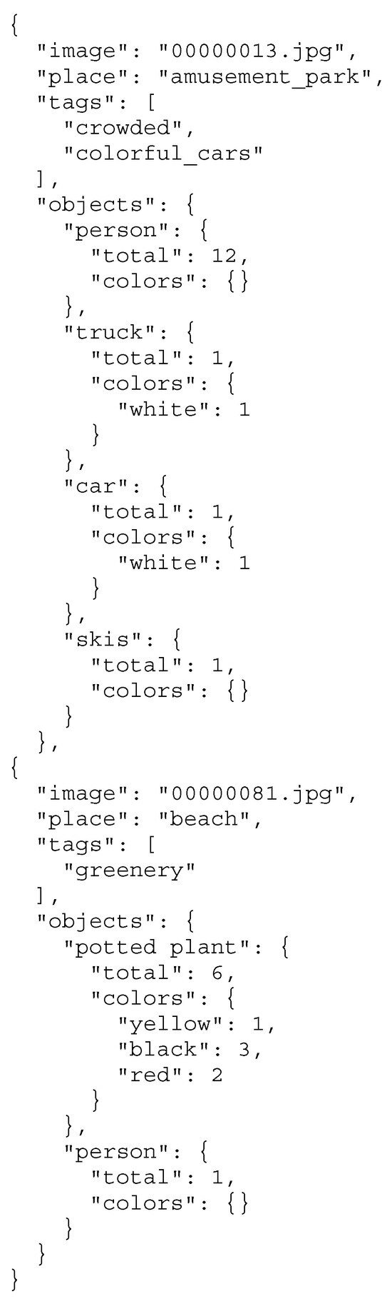 - Objects: the object classes (e.g., “person”, “truck”) and the values are their respective counts in the image. Furthermore, it separates each item based on other categories (i.e., color), counting each variation of the object separately.