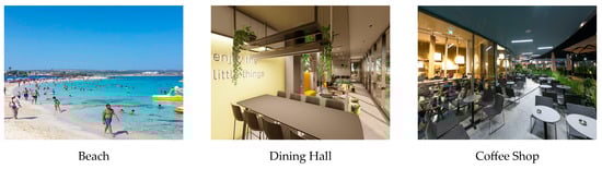 The evaluation dataset encompasses seven POI categories that provide a representative range of visual and contextual conditions: amusement parks (23 images), aquariums (9), beaches (54), cafeterias (45), university campuses (19), football fields (30), and water parks (20). These categories collectively balance indoor and outdoor scenes, structured and open spaces, and varying levels of visual complexity. Such diversity allows a comprehensive assessment of WORLDO’s ability to retrieve semantically and visually relevant POIs across heterogeneous environments.