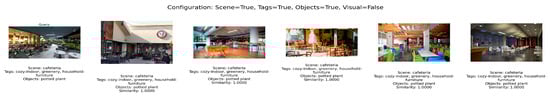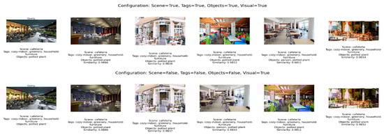 For the Dining Hall and Coffee Shop images, the system maintained perfect performance even when individual components were disabled, including visual features. This suggests that in some scenes, semantic features such as tags, objects, or scene class alone can be sufficient for effective recommendation. Figure 8 presents the recommendations generated by the recommender system based on the input image of the Coffee Shop. The results clearly reflect the influence of the image’s visual features. However, when the system is configured to exclude visual features, the recommendations rely primarily on the contextual elements derived from semantic analysis.