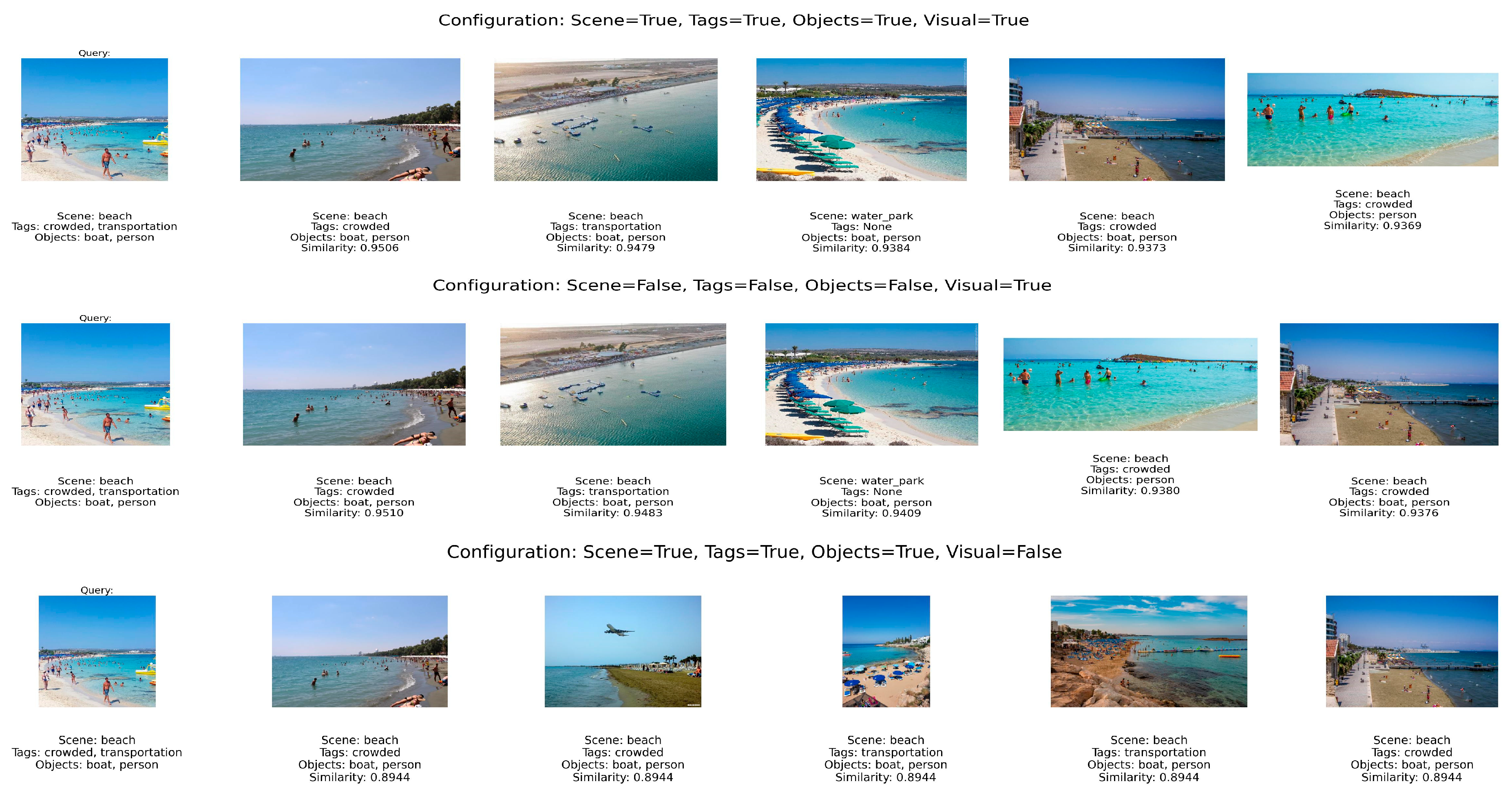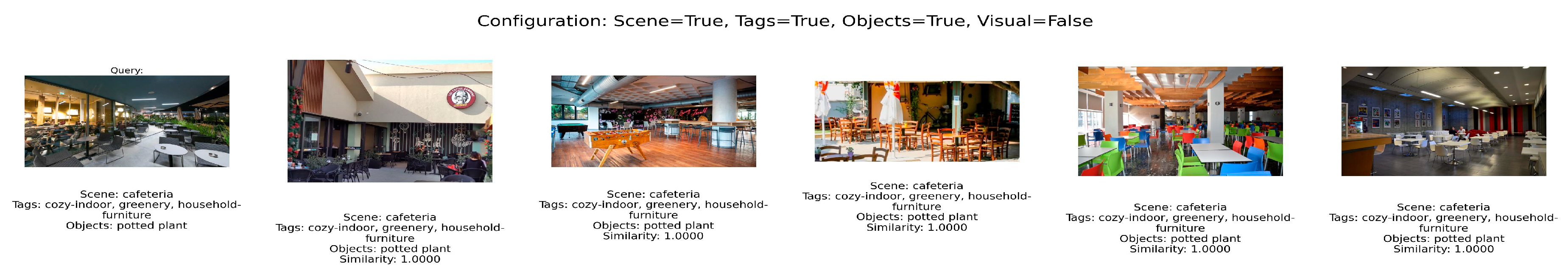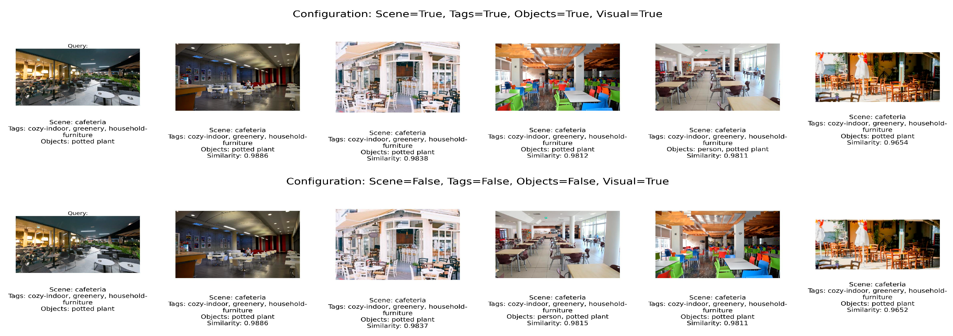 - Objects: Objects represent the specific items present in the scene, such as cars, people, or plants. Objects, just like tags, are encoded in a multi-hot format. If disabled, object-based information is ignored during similarity computation.