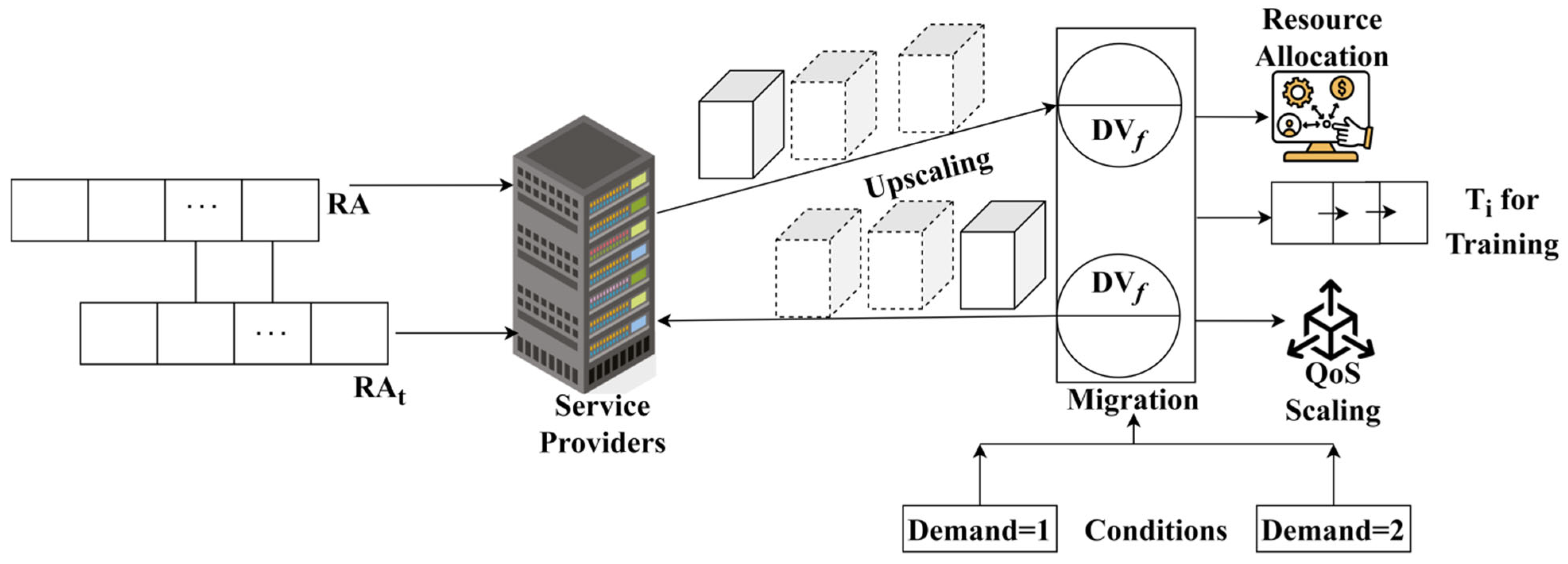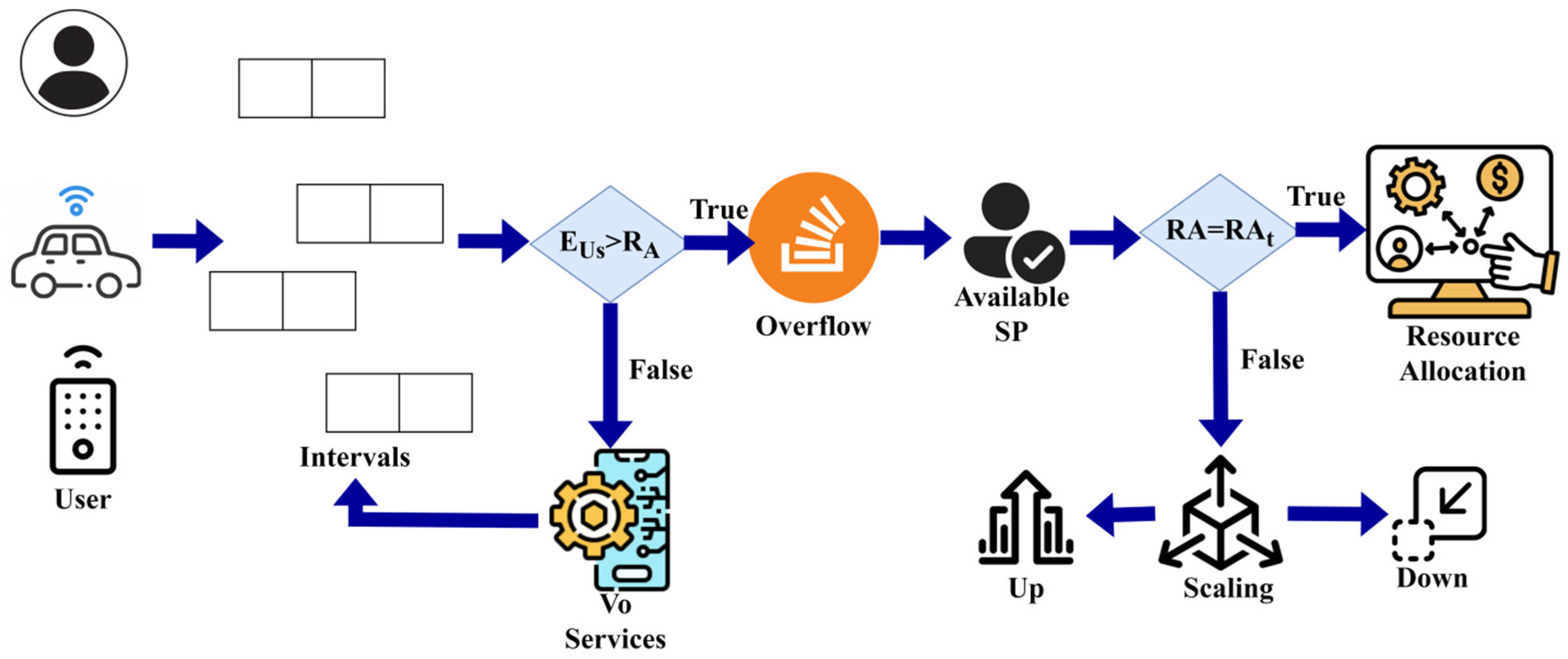 . This output likely acts as a metric or indicator of the effectiveness of resource up-scaling and down-scaling in relation to the allocation time intervals. This equation is instrumental in assessing the efficiency and effectiveness of dynamic resource allocation in computing systems, especially in scenarios where quality of service is a crucial consideration. It facilitates the evaluation of how well the system adjusts its resource allocation over time to satisfy service demands or performance criteria. The auto-scaling process decision is illustrated in