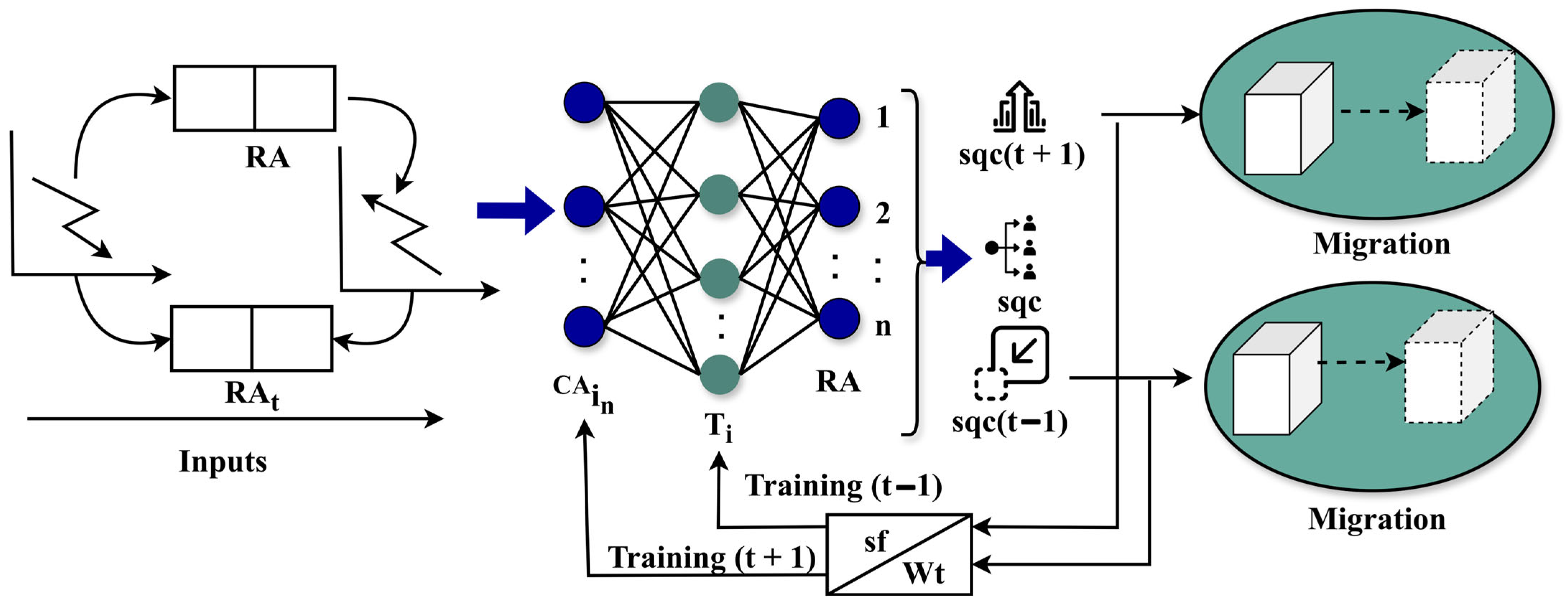 is to achieve maximum resource allocation in the cloud platform. Equations (11) and (12) compute wait time and service failure between the current and next computing allocation intervals to enhance resource allocation. The proposed PASM is used to ensure the quality of resource allocation with recurrent training and scaling verification, assisted by a high-to-low demand ratio, which reduces wait time and failure. The optimal output is less wait time and operation costs to perform multiple services in a cloud platform using scaling and migration, which is fed to the learning process for achieving high-quality services with less wait time. The proposed method is described in Algorithm 1.