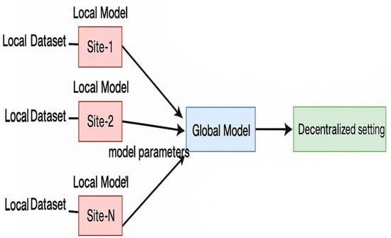 The multiple clients within FL collaborate to train a model and at the same time ensure the data is decentralized. The training process within the FL consists of the following steps: (1) Every institution is responsible to estimate its gradients and then sublimate the trained network parameters computed locally to the server. (2) The server accumulates the uploaded parameters from all the ‘K’ institutions. (3) Now the server begins to broadcast the accumulated parameters to all the ‘K’ institutions. (4) Every institution then updates its local model with the aggregated parameters and begins testing the performance of their respective models as shown in Figure 2. Collectively the institutions learn a ML model with the help of the cloud server [15]. A global optimum model is obtained after an umpteen number of training exercises and exchanges between the institutions and the server have taken place.