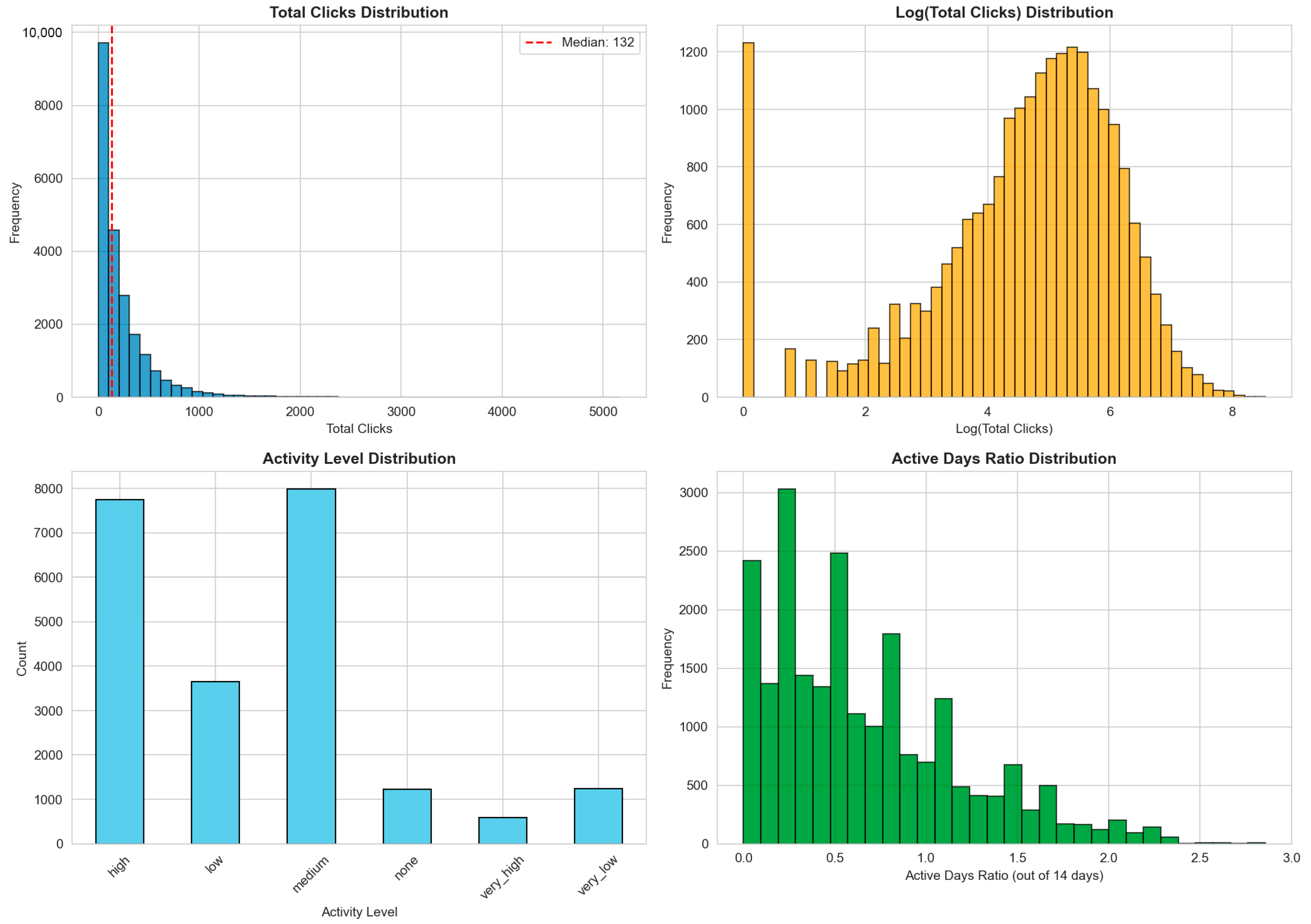 18] demonstrated that mid-semester predictions using LMS activity data significantly predict final course achievement, with measures of regular study patterns, late submissions, and login frequency showing strong associations with outcomes. The study emphasized that meaningful behavioral indicators outperform simple frequency counts, a finding we incorporate by engineering features that capture engagement patterns rather than raw click totals. However, You’s mid-semester timing may be too late for students who disengage early, motivating our choice of a 14-day window.