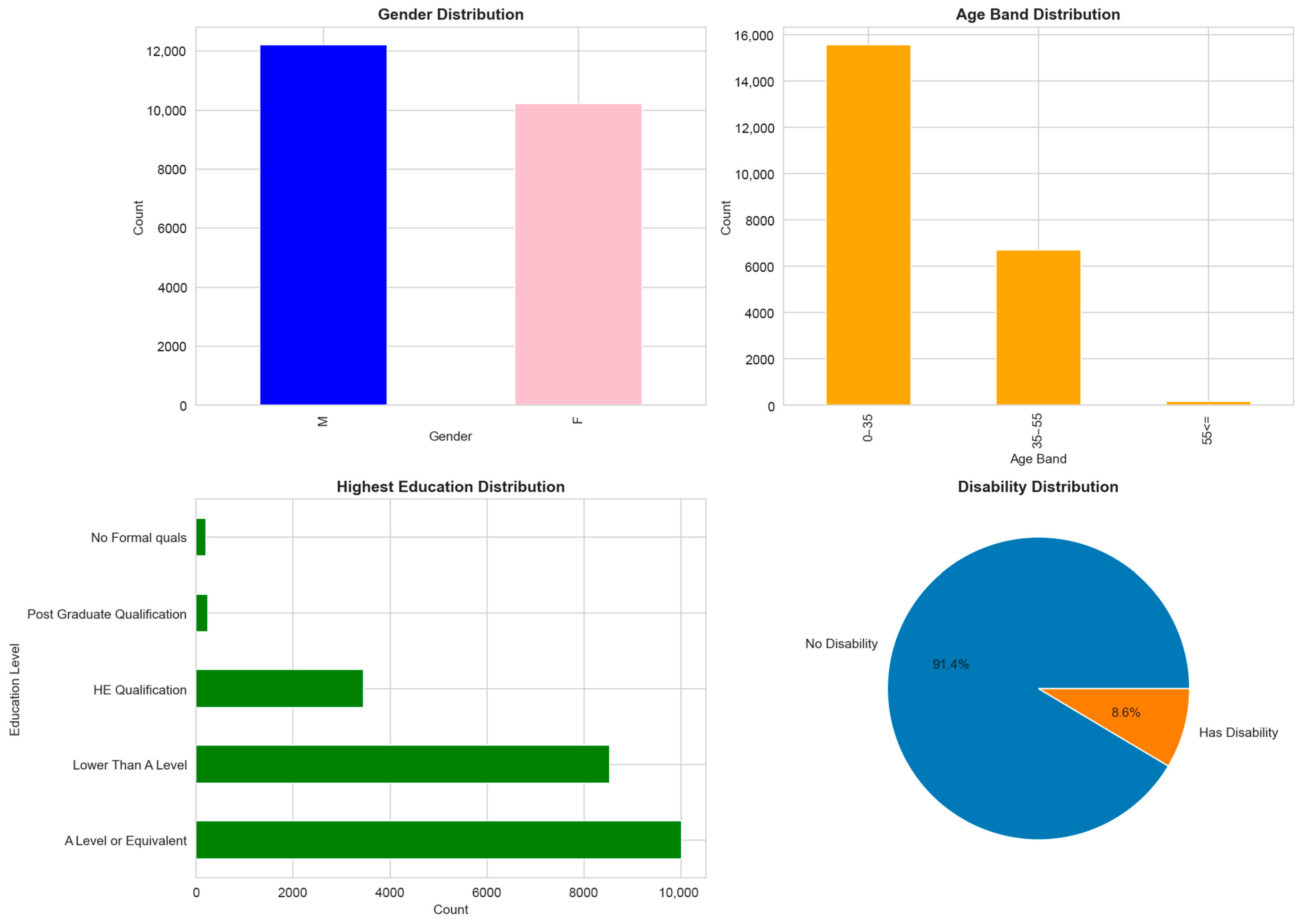 10] developed an interpretable framework using GPU-accelerated machine learning to analyze e-learning platform data, combining predictive models with regression and classification to identify factors impacting student performance. They found that activity-based features dominated demographic variables in predictive importance, confirming that what students do matters more than who they are. Our feature importance analysis replicates this finding: activity metrics (total_clicks, active_days_ratio) and assessment performance (first_assessment_score) far outweigh demographic factors in determining failure risk.