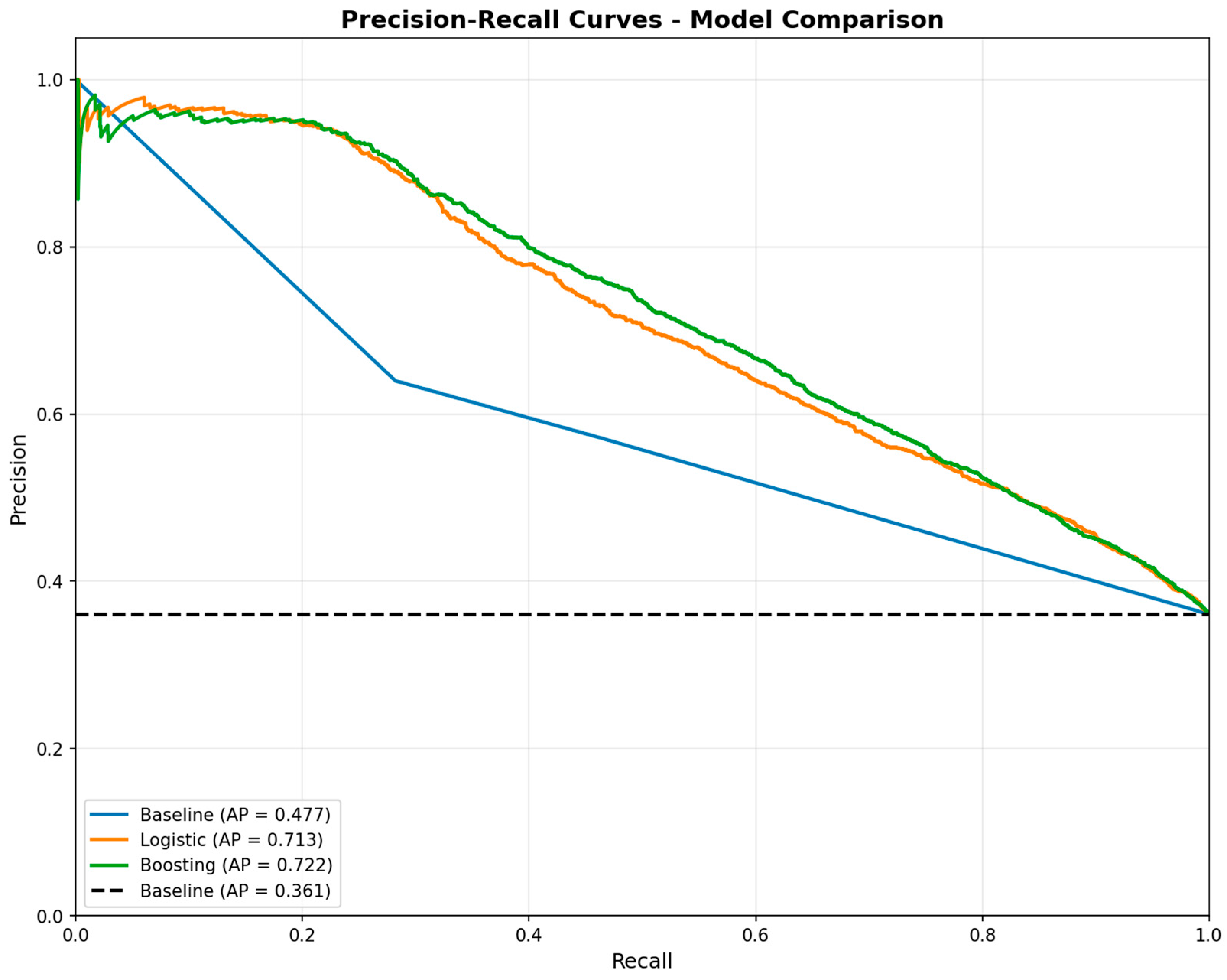 Our results demonstrate that early warning systems based on two weeks of LMS data can achieve meaningful discrimination between students who will pass and those who will fail, while maintaining the interpretability and workload constraints necessary for real-world deployment. The gradient boosting model’s AUC of 0.789 and average precision of 0.722 represent solid performance given the extremely early prediction timing (day 14 of approximately 200 days). More importantly, the near-identical performance of logistic regression (AUC 0.783, AP 0.713) suggests that linear models capture most of the predictive signal, making interpretability essentially free—a finding with important implications for adoption.